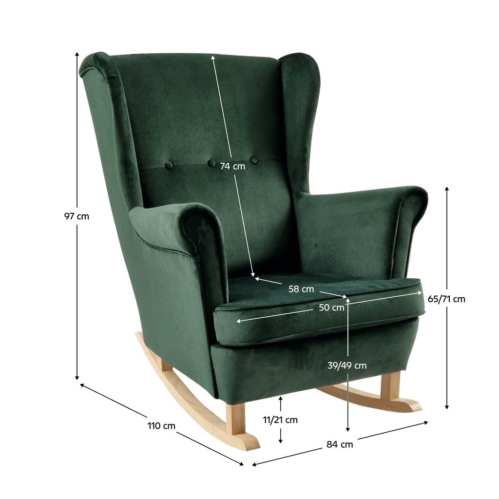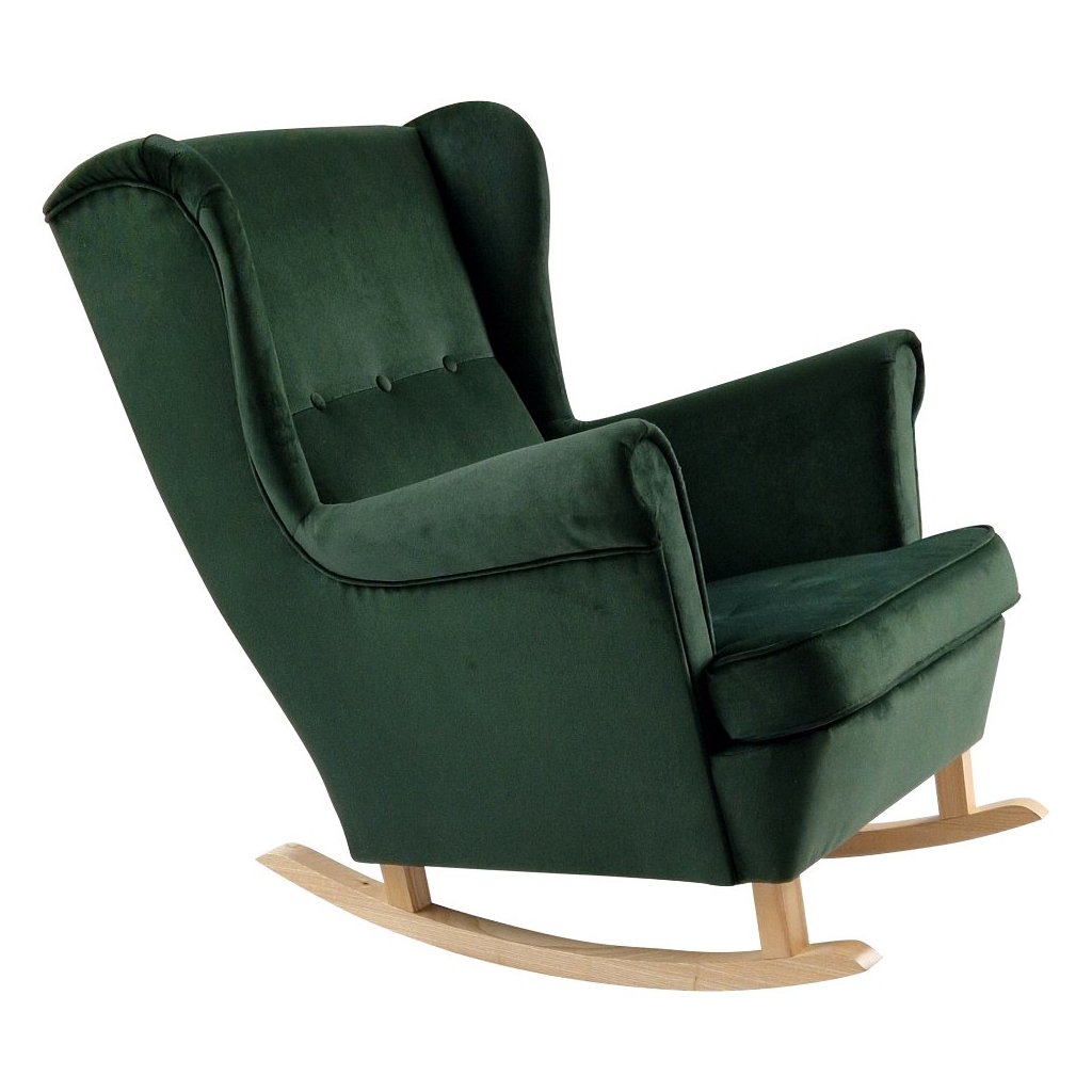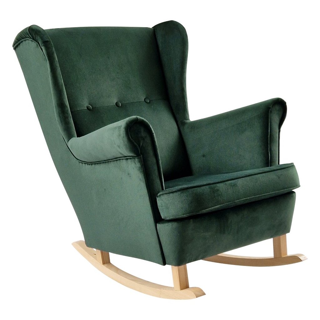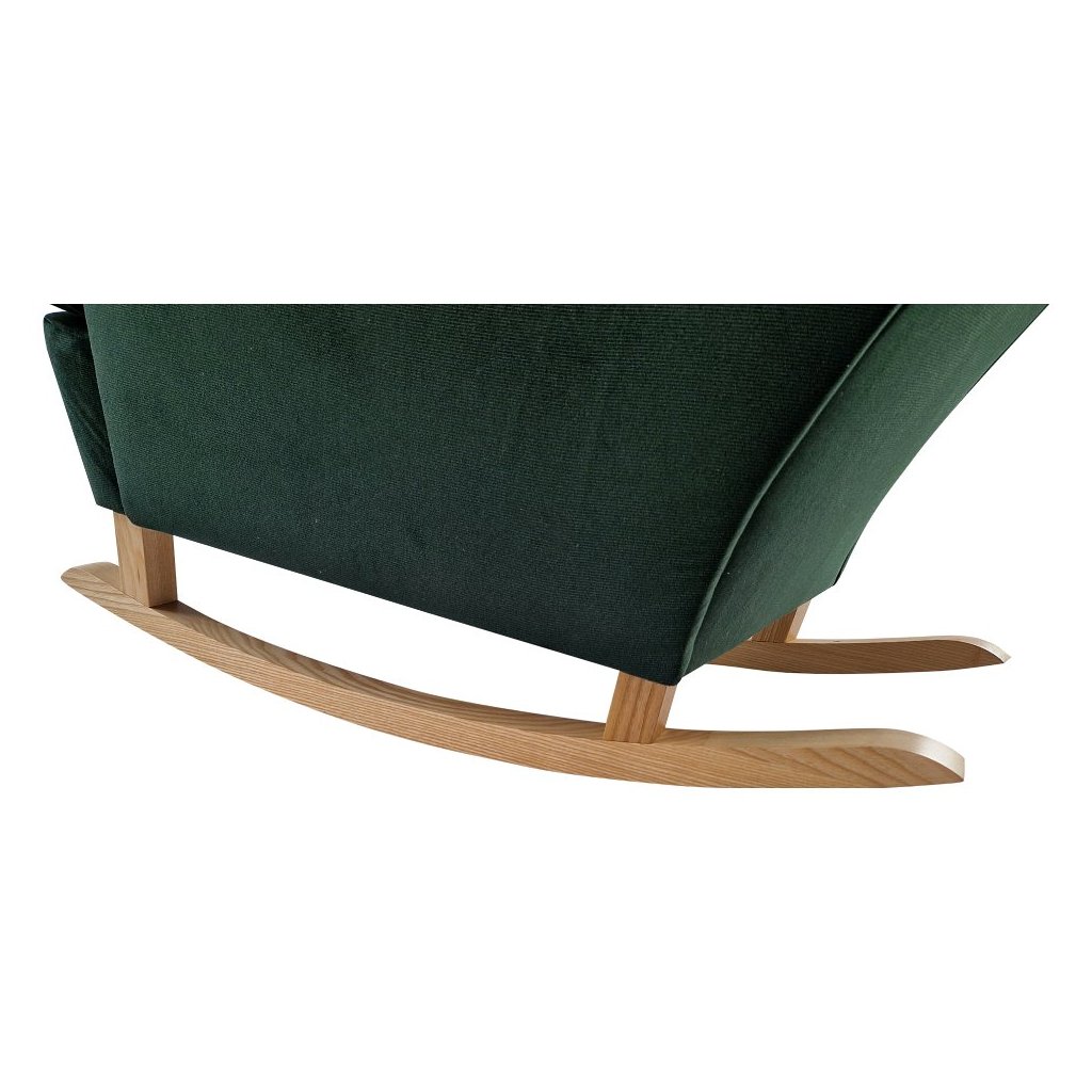 Hojdacie kreslo TEJA v elegantnej zelenej látke prináša pohodlie a štýl do každej obývačky či spálne. Vysoká opierka a opierky na ruky zabezpečia dokonalý relax. Stabilné drevené nožičky.