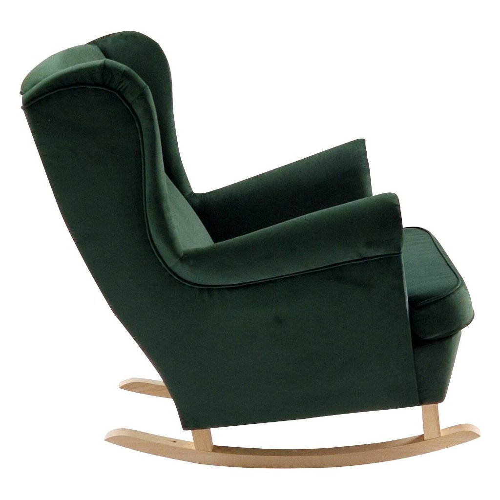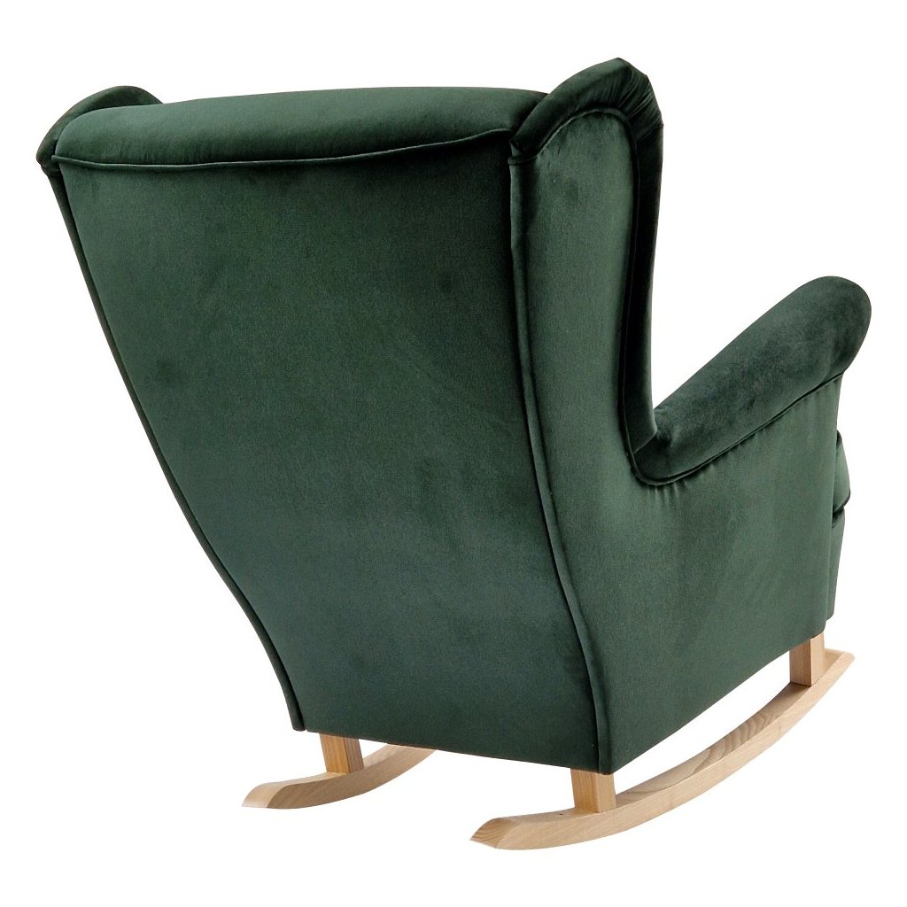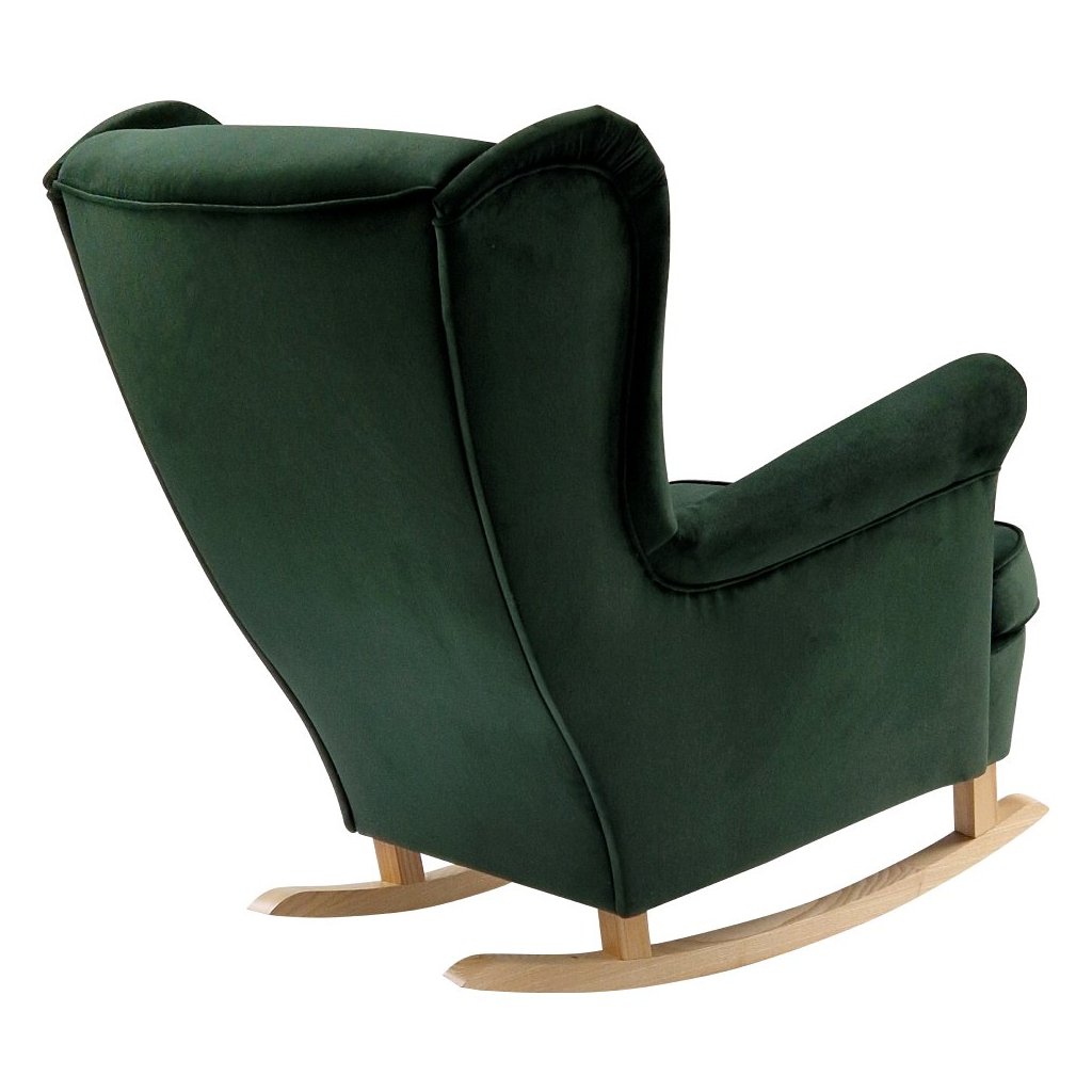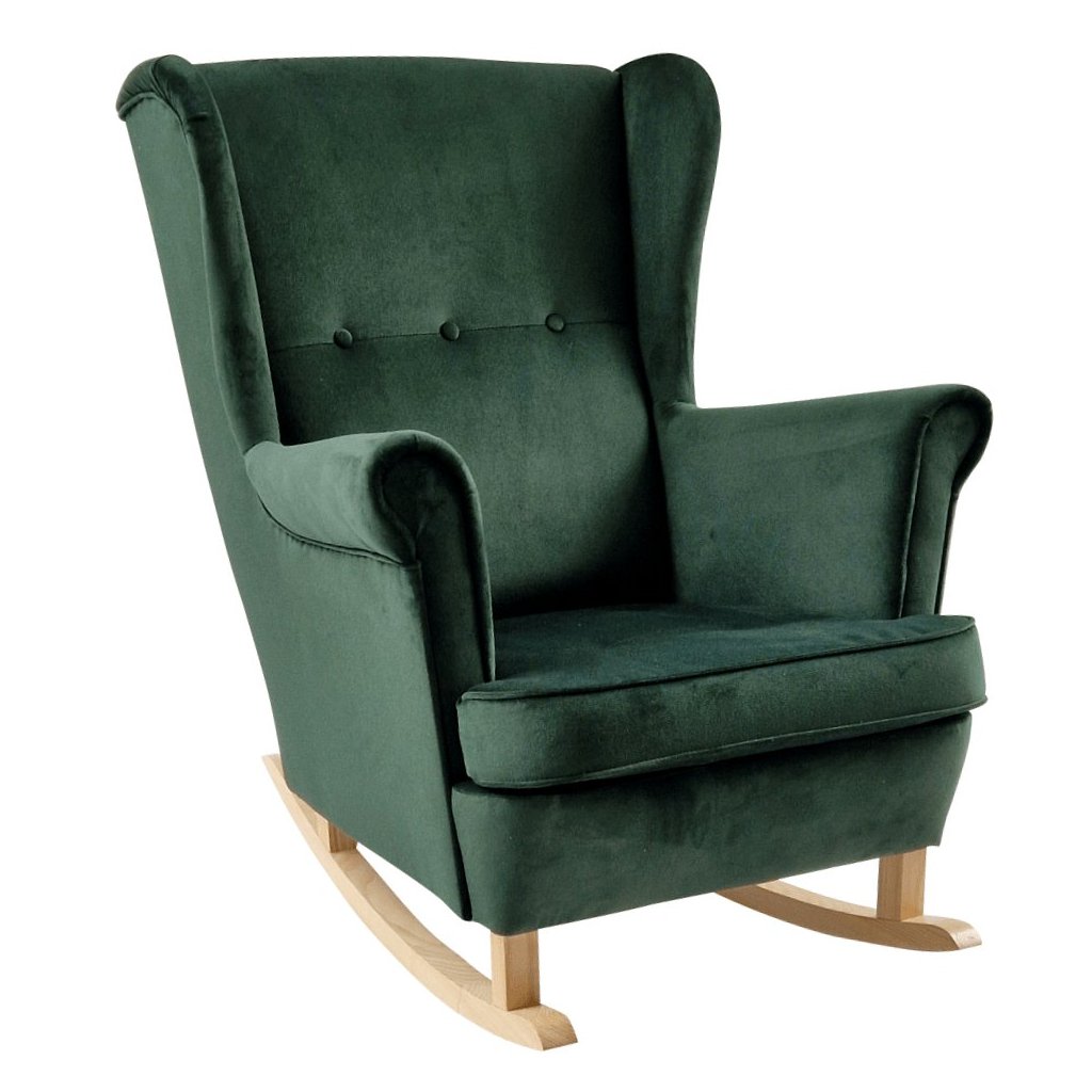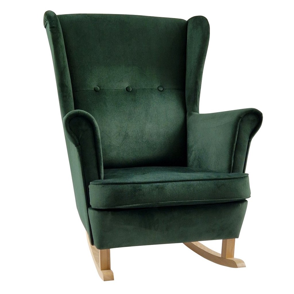 Hojdacie kreslo TEJA v elegantnej zelenej látke prináša pohodlie a štýl do každej obývačky či spálne. Vysoká opierka a opierky na ruky zabezpečia dokonalý relax. Stabilné drevené nožičky.