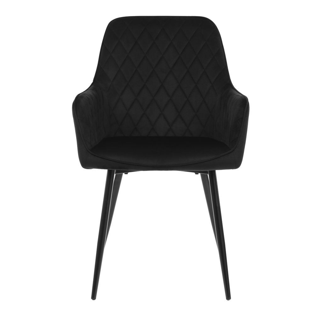 Jedálenská stolička ARNO v čiernej zamatovej látke ponúka pohodlné sedenie s ergonomickými podrúčkami. Pevné kovové nohy zaručujú stabilitu a moderný dizajn s prešitím v kosoštvorcovom vzore.