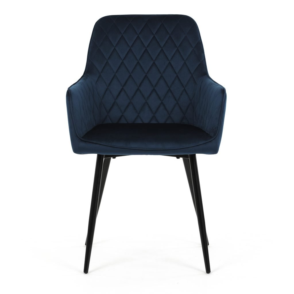 Jedálenská stolička ARNO s modrou zamatovou látkou ponúka elegantný dizajn a pohodlie. Pevné čierne kovové nohy zaručujú stabilitu, zatiaľ čo prešívanie a integrované podrúčky dodávajú štýl.
