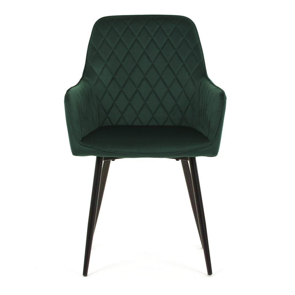 Jedálenská stolička ARNO v zelenej zamatovej látke ponúka pohodlné sedenie s moderným dizajnom. Pevné čierne kovové nohy a integrované podrúčky zaručujú stabilitu a komfort. Vhodná do jedální a kaviar