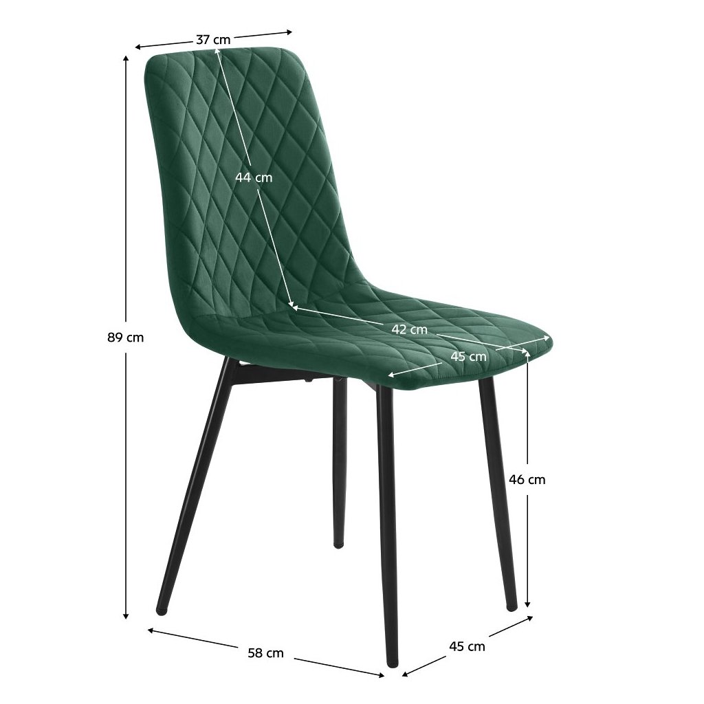 Jedálenská stolička DAMIA v smaragdovej zamatovej látke je elegantným spojením komfortu a štýlu. Stabilná kovová konštrukcia a odolná textília zaručujú dlhú životnosť. Rozmery: 45x58x89 cm.