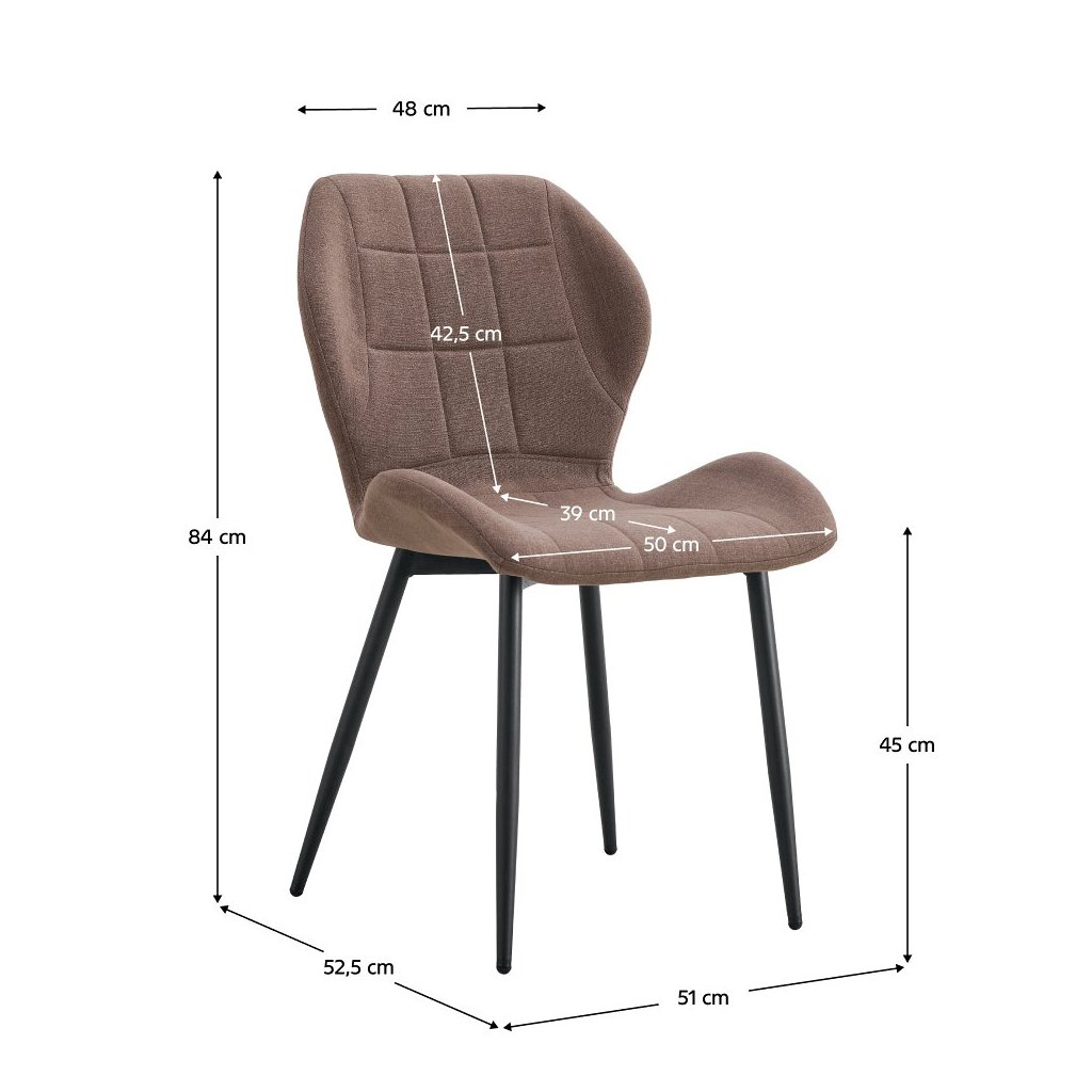 Moderná jedálenská stolička MAKENA v hnedej látke je skvelou voľbou do kuchyne či obývačky. Stabilná čierna kovová konštrukcia a dekoratívne prešitie zaručujú štýl a pohodlie. Nosnosť 110 kg.