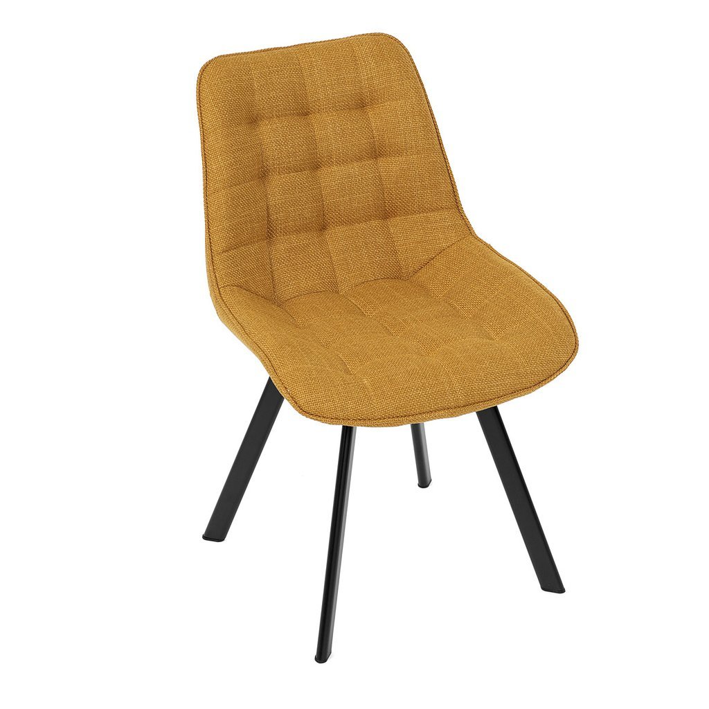 Žiarivo žltý odtieň stoličky spolu s dizajnovým prešitím na operadle vytvára elegantný a moderný vzhľad. Stolička je vyrobená z odolnej látky, ktorá zaručuje dlhú životnosť a komfort aj pri dlhšom sedení. Kovové nohy stoličky poskytujú stabilitu a elegantne dopĺňajú celkový dizajn.