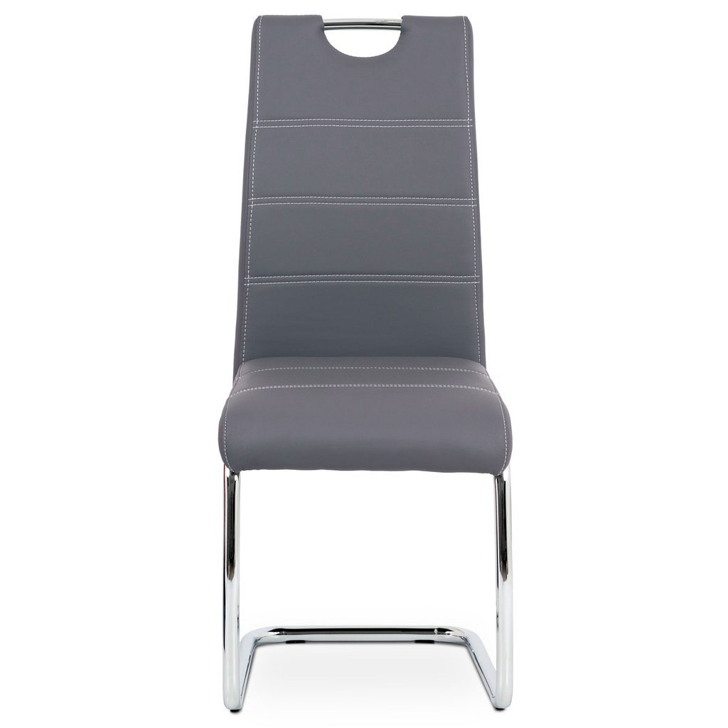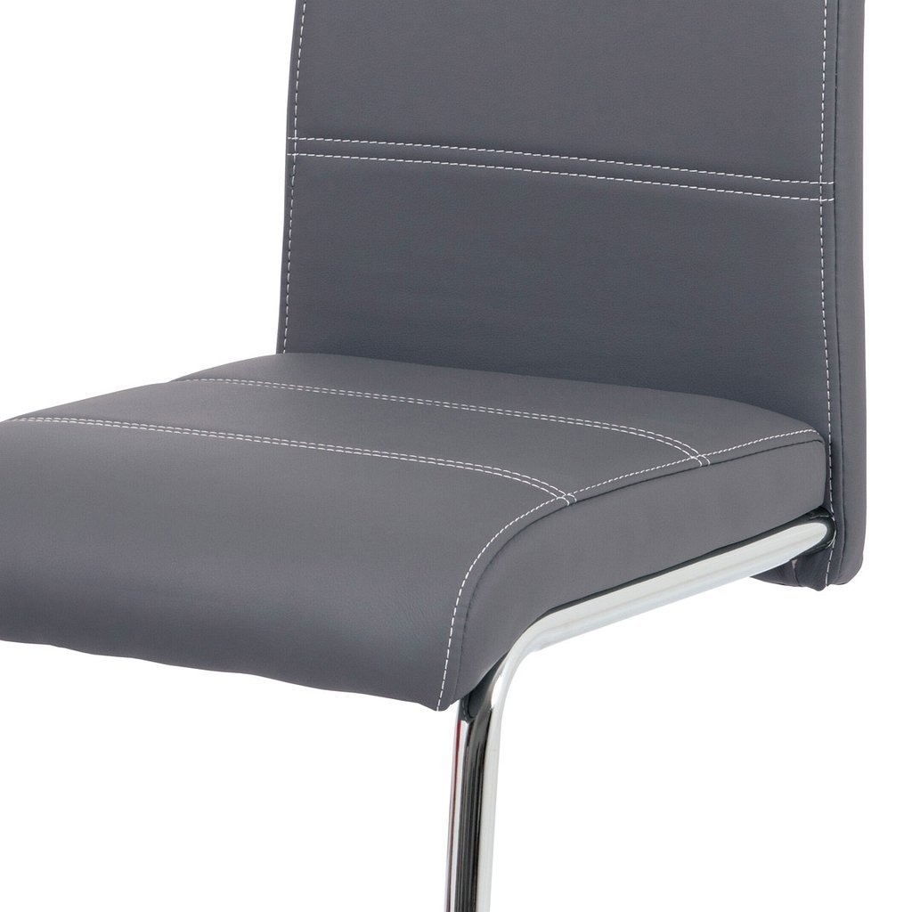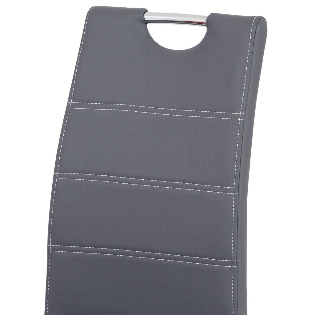 Jedálenská stolička NIKA v modernom prevedení ponúka elegantnú kombináciu funkčnosti a štýlu. Poťah z ekokože v šedej farbe s bielym prešitím vytvára atraktívny vizuálny efekt, ktorý obohatí každý jedálenský priestor. Hojdacia kovová podnož v chrómovanom prevedení zabezpečuje nie len stabilitu, ale aj pohupovací komfort, ktorý zaručuje príjemné sedenie pri jedle.