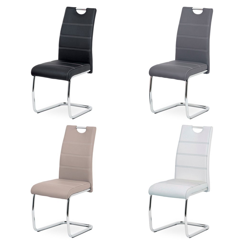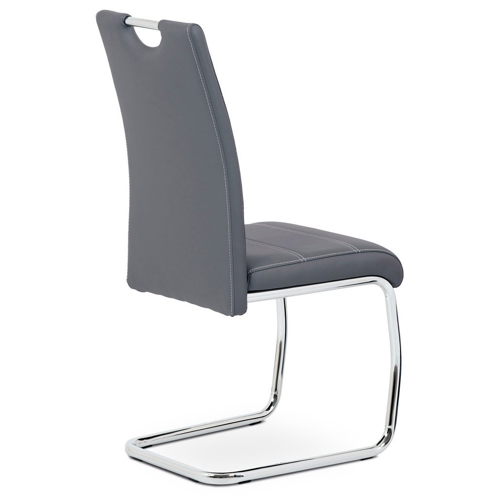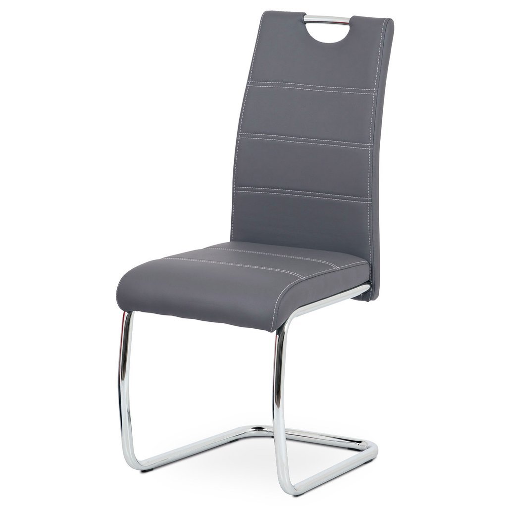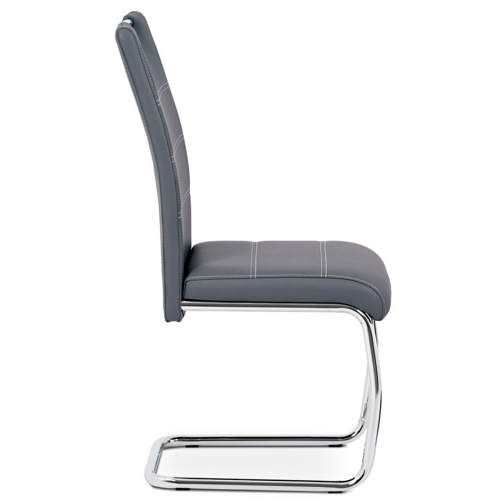 Jedálenská stolička NIKA v modernom prevedení ponúka elegantnú kombináciu funkčnosti a štýlu. Poťah z ekokože v šedej farbe s bielym prešitím vytvára atraktívny vizuálny efekt, ktorý obohatí každý jedálenský priestor. Hojdacia kovová podnož v chrómovanom prevedení zabezpečuje nie len stabilitu, ale aj pohupovací komfort, ktorý zaručuje príjemné sedenie pri jedle.
