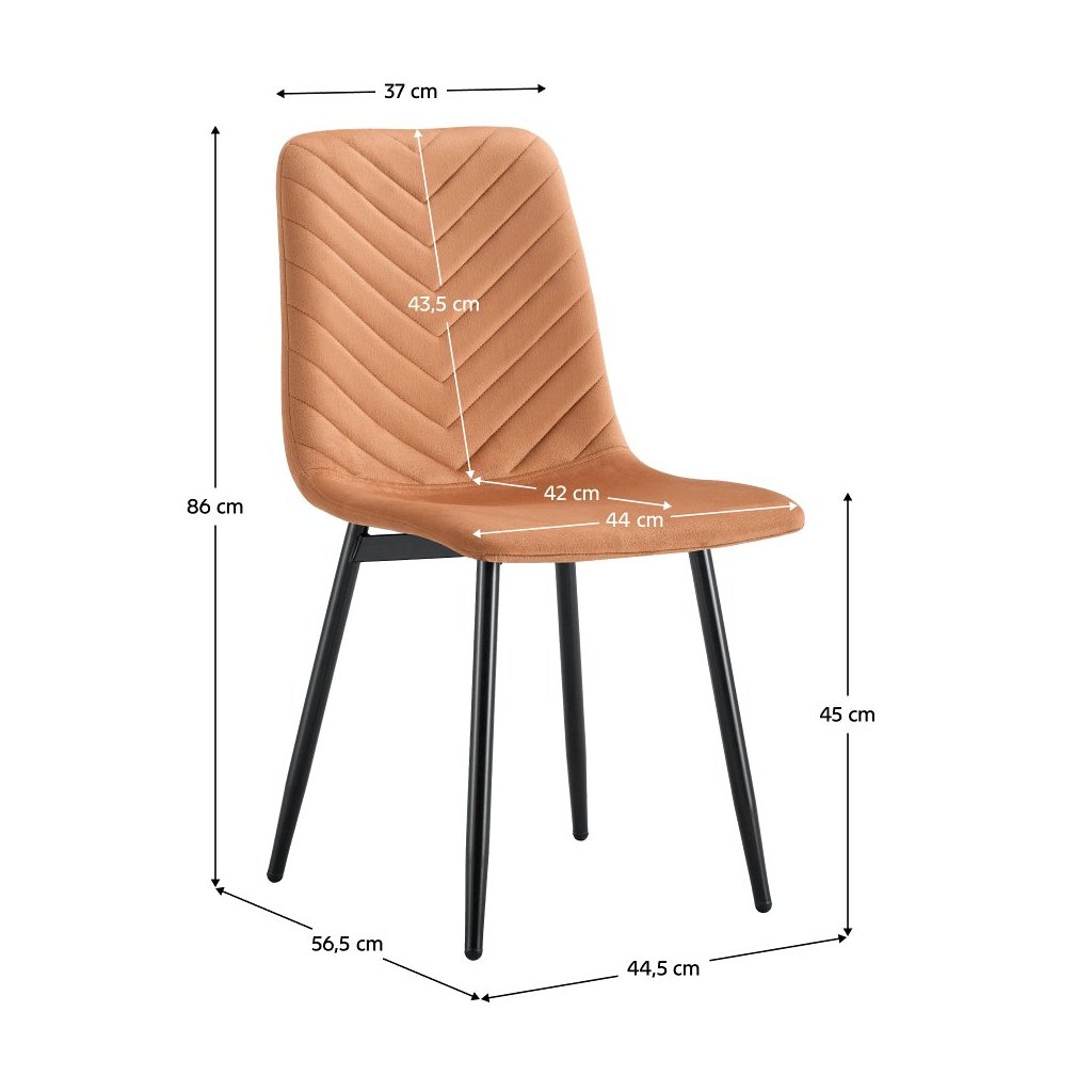 Jedálenská stolička RAMITA v terakotovej zamatovej látke ponúka komfort a moderný dizajn. Čalúnenie je príjemné na dotyk, čierne kovové nožičky zabezpečujú stabilitu. Rozmery: 44,5x56,5x86 cm.