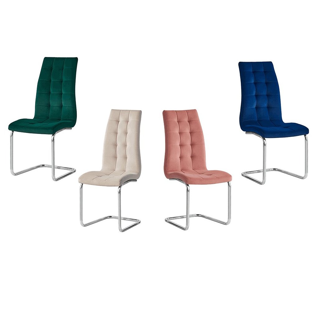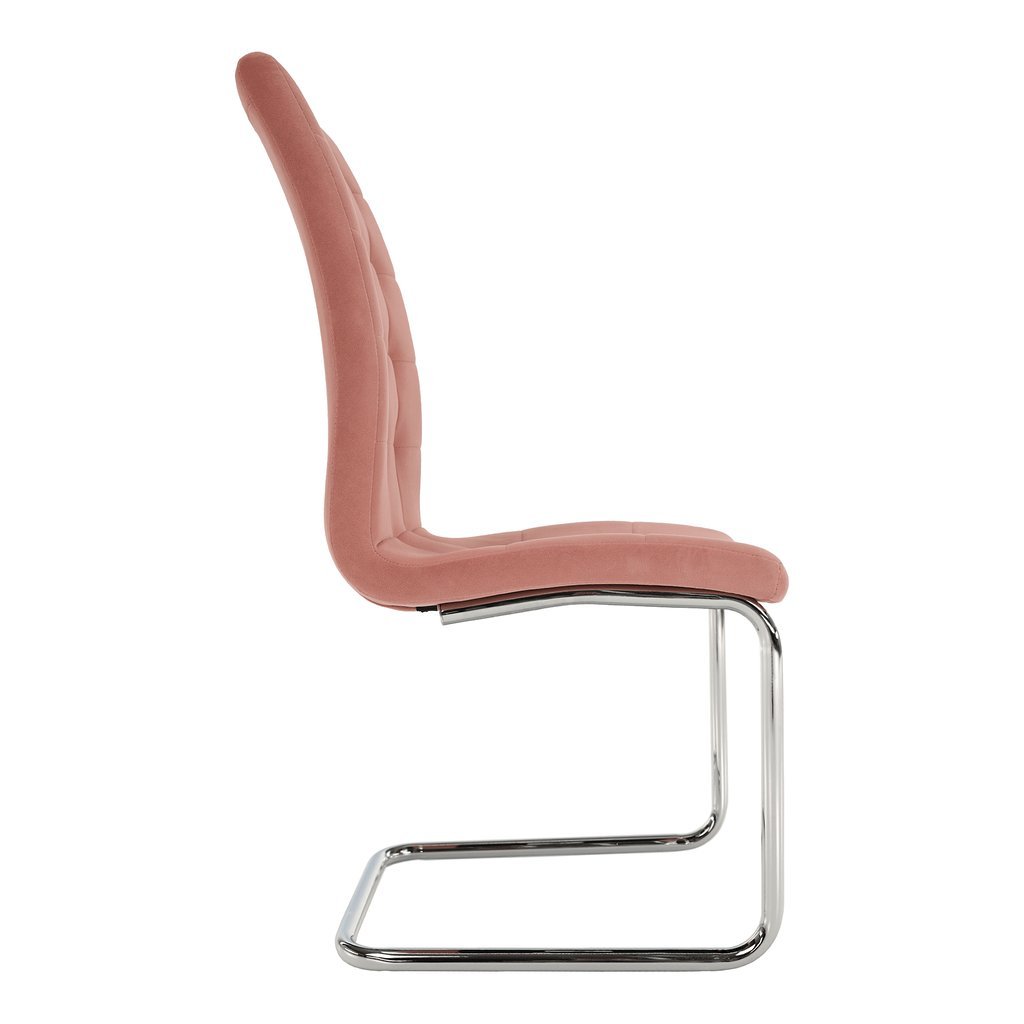 Jedálenská stolička SALOMA v ružovom zamatovom prevedení kombinuje moderný dizajn s luxusným chrómovaným podvozkom. Príjemná textília a vysoká odolnosť robia z tejto stoličky ideálny doplnok do každej