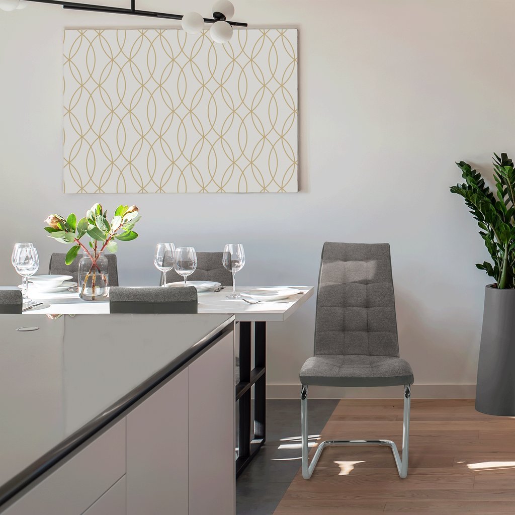 Chrómované nohy stoličky dodávajú jej luxusný vzhľad a trvácnosť, zatiaľ čo príjemná látka zaručuje pohodlie pri sedení. Vytvorte si útulné a súčasné prostredie s touto štýlovou jedálenskou stoličkou, ktorá je ideálnym riešením pre každodenné posedenia s rodinou alebo priateľmi.