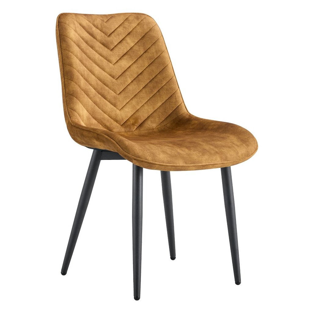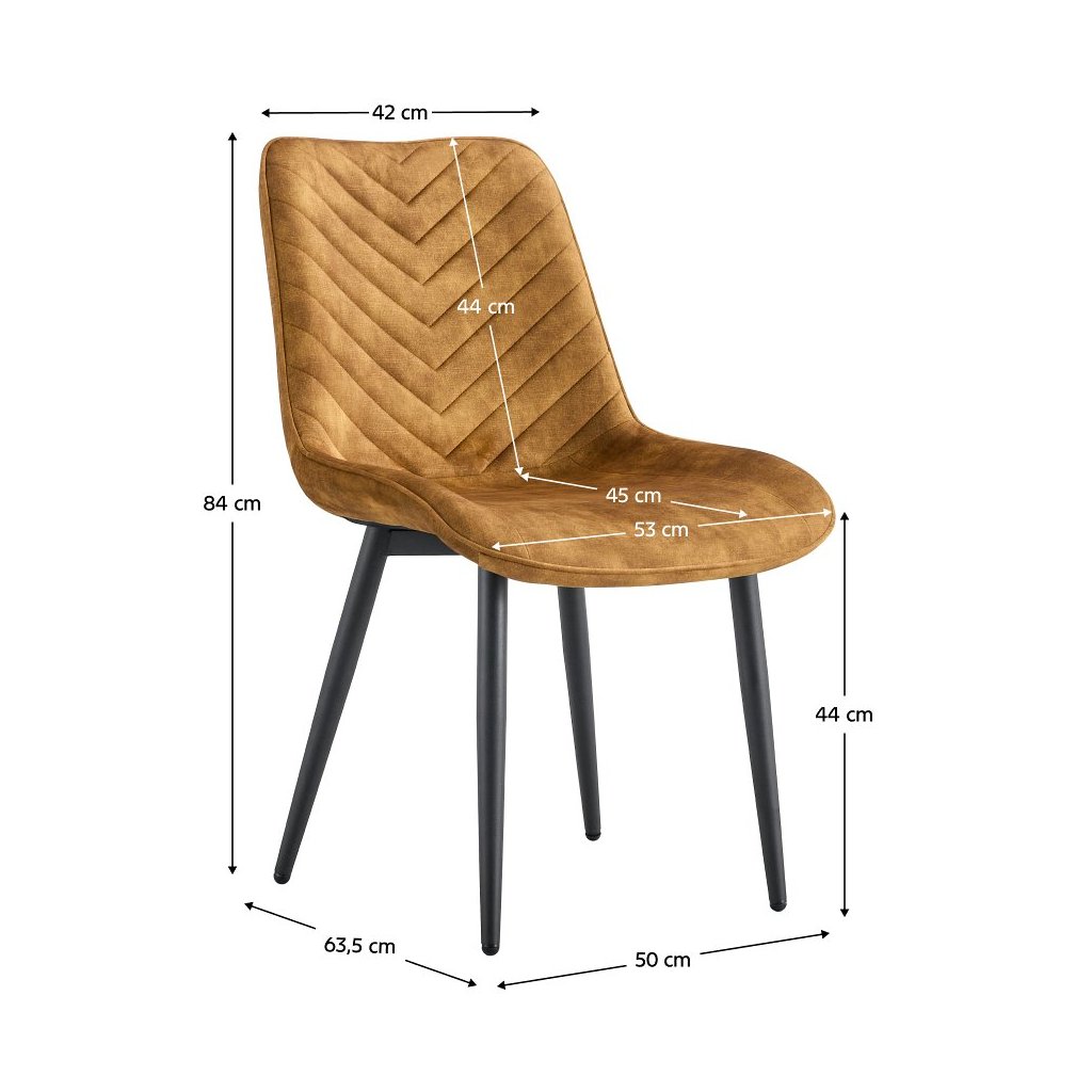 Jedálenská stolička ZAINA v hnedozlatej zamatovej látke ponúka moderný dizajn a pohodlie. Stabilné čierne kovové nohy a dekoratívne šitie zaručujú kvalitu a štýl. Rozmery: 50x63,5x84 cm.