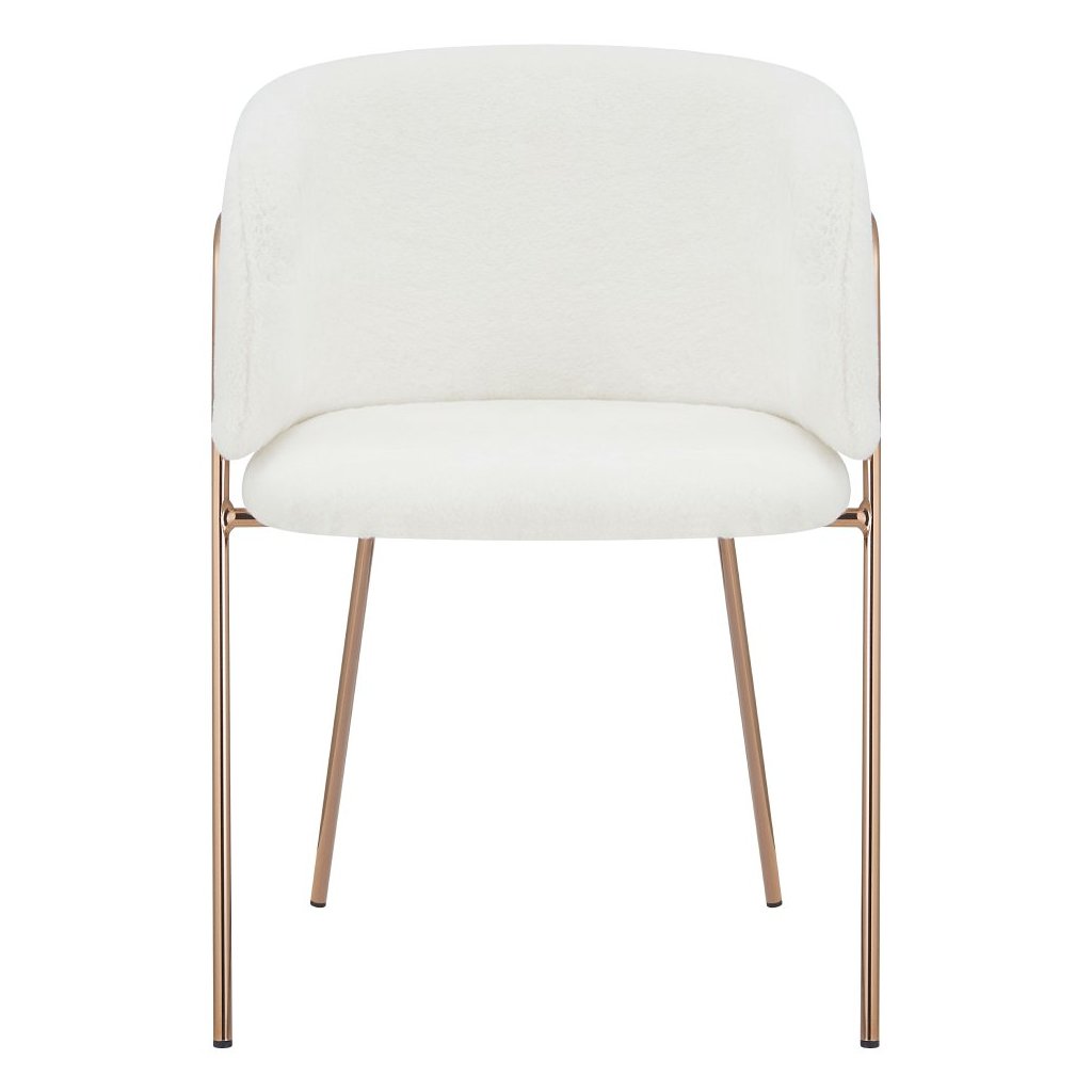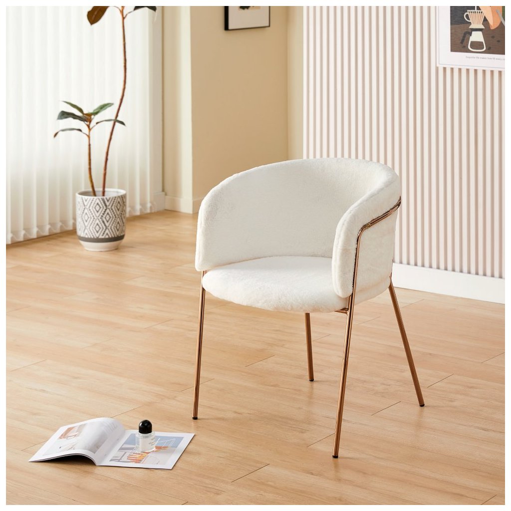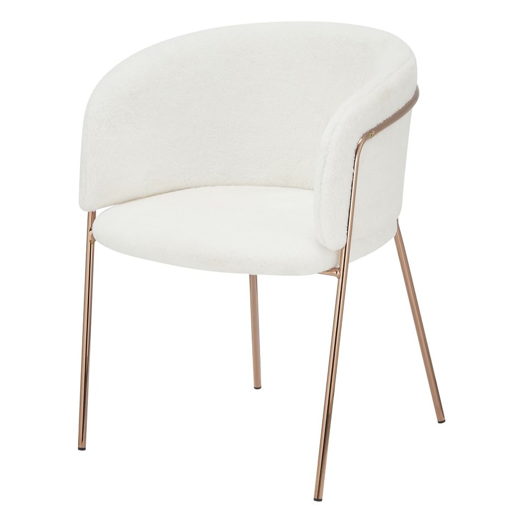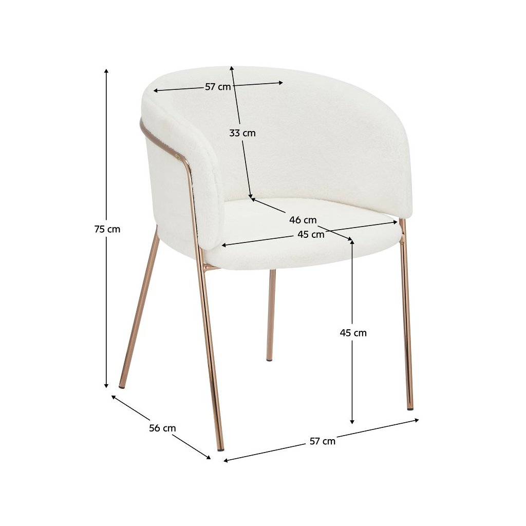 Jedálenské kreslo ADIMAR s bielou kožušinou prináša moderný a elegantný štýl do vašej jedálne. Komfortné sedenie, opierky na ruky a rose gold chróm dodajú interiéru šarm.