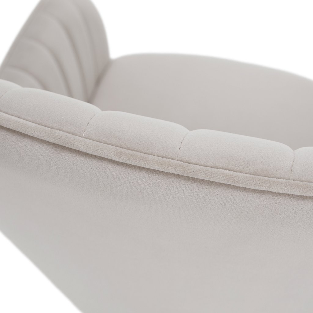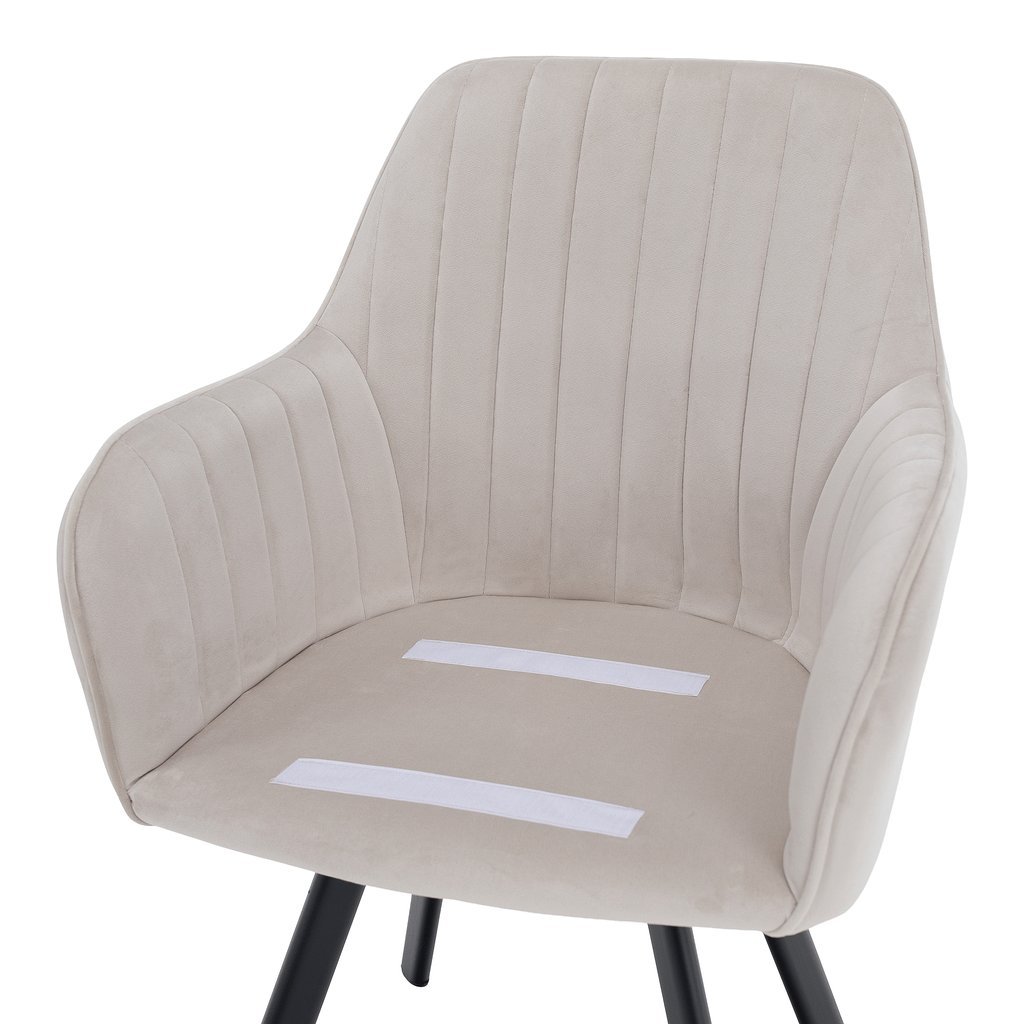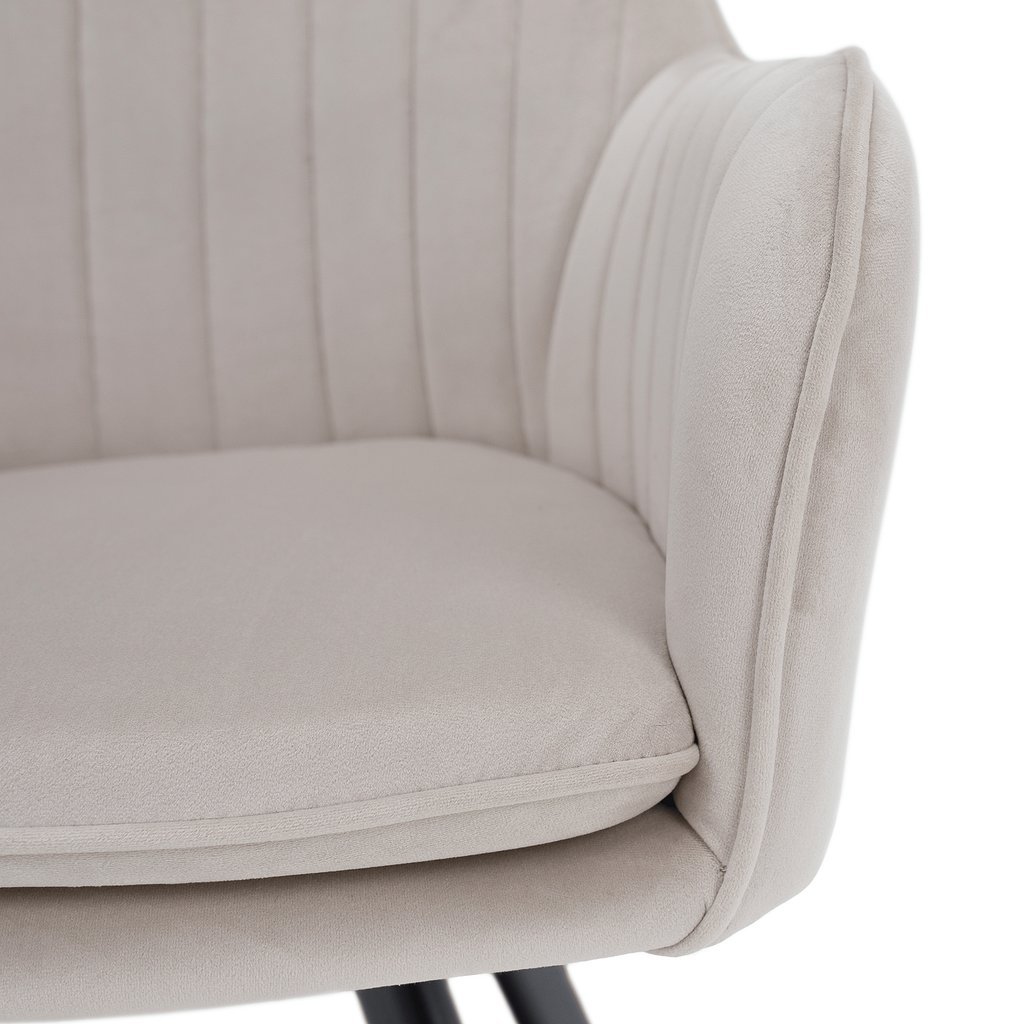 Kreslo je čalúnené v béžovej zamatovej látke, ktorá dodáva priestoru útulnosť a luxus. Kovové nohy v čiernej farbe sú zárukou stability a dlhodobej odolnosti, pričom pohodlné opierky na ruky a prešité chrbtové opierky ponúkajú maximálny komfort pri sedení.