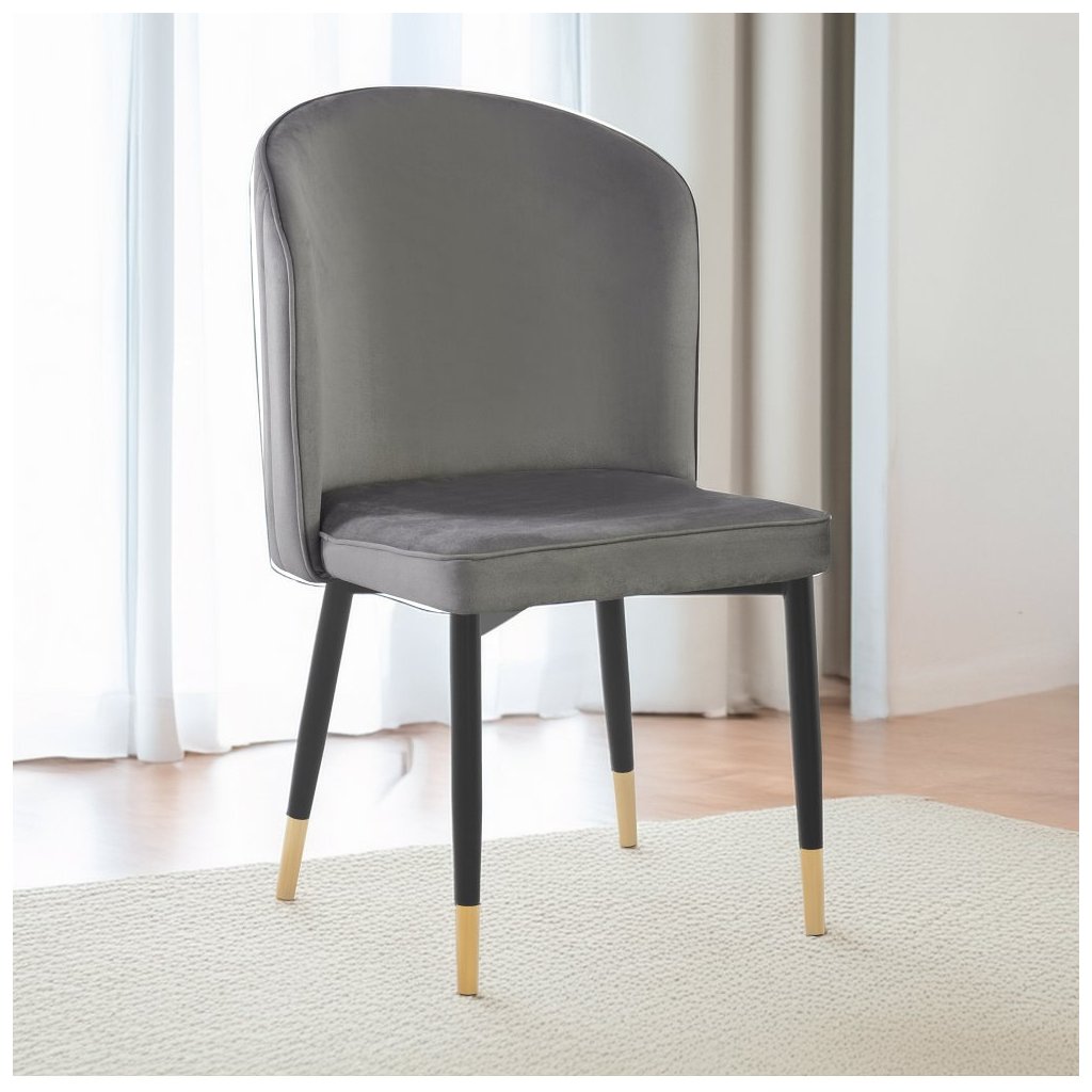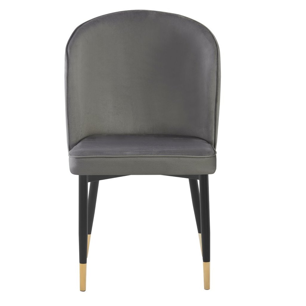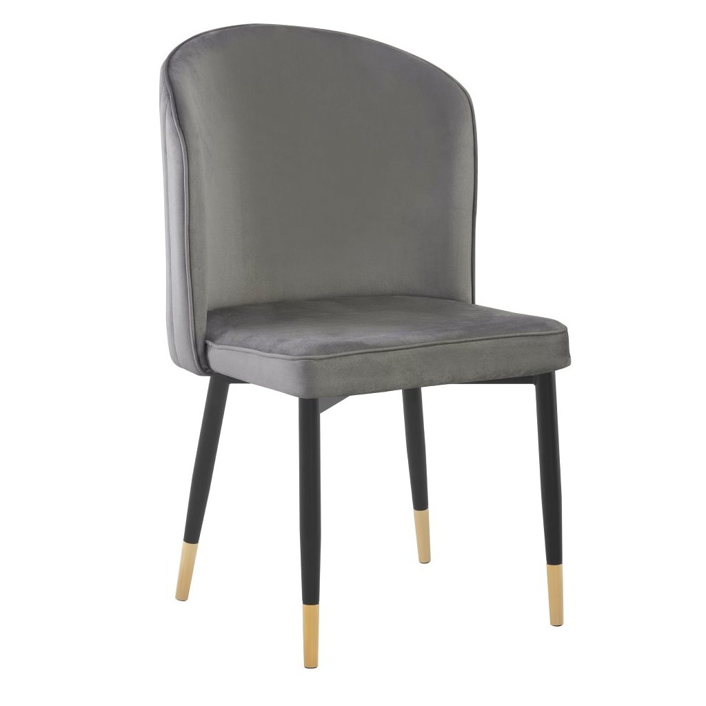 Jedálenské kreslo UDAJA v sivej zamatovej látke kombinuje eleganciu a pohodlie. S jemne zaobleným operadlom a stabilnými čiernymi kovovými nohami so zlatým detailom je ideálnym doplnkom.