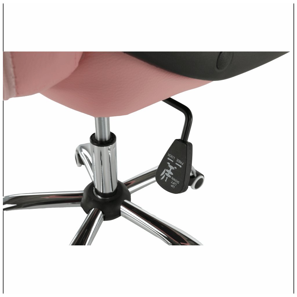 Kancelárska stolička RULIS v ružovej ekokoži kombinuje štýlový dizajn s pohodlím. Nastaviteľná výška, hojdací mechanizmus a pogumované kolieska zaručujú komfort na každej podlahe.