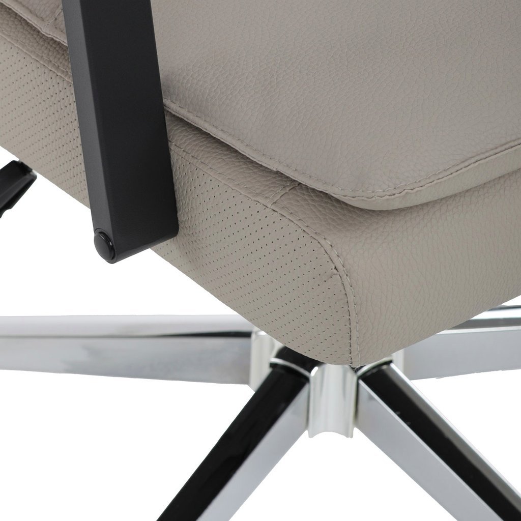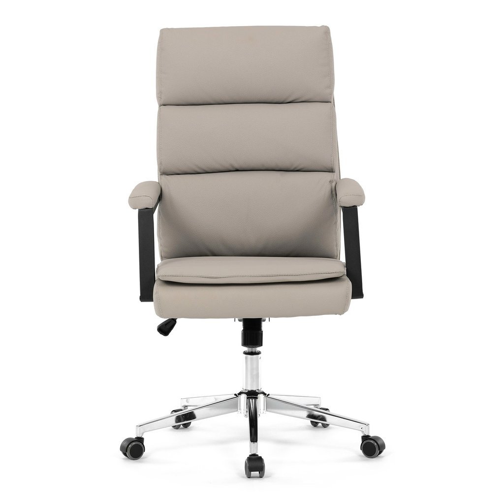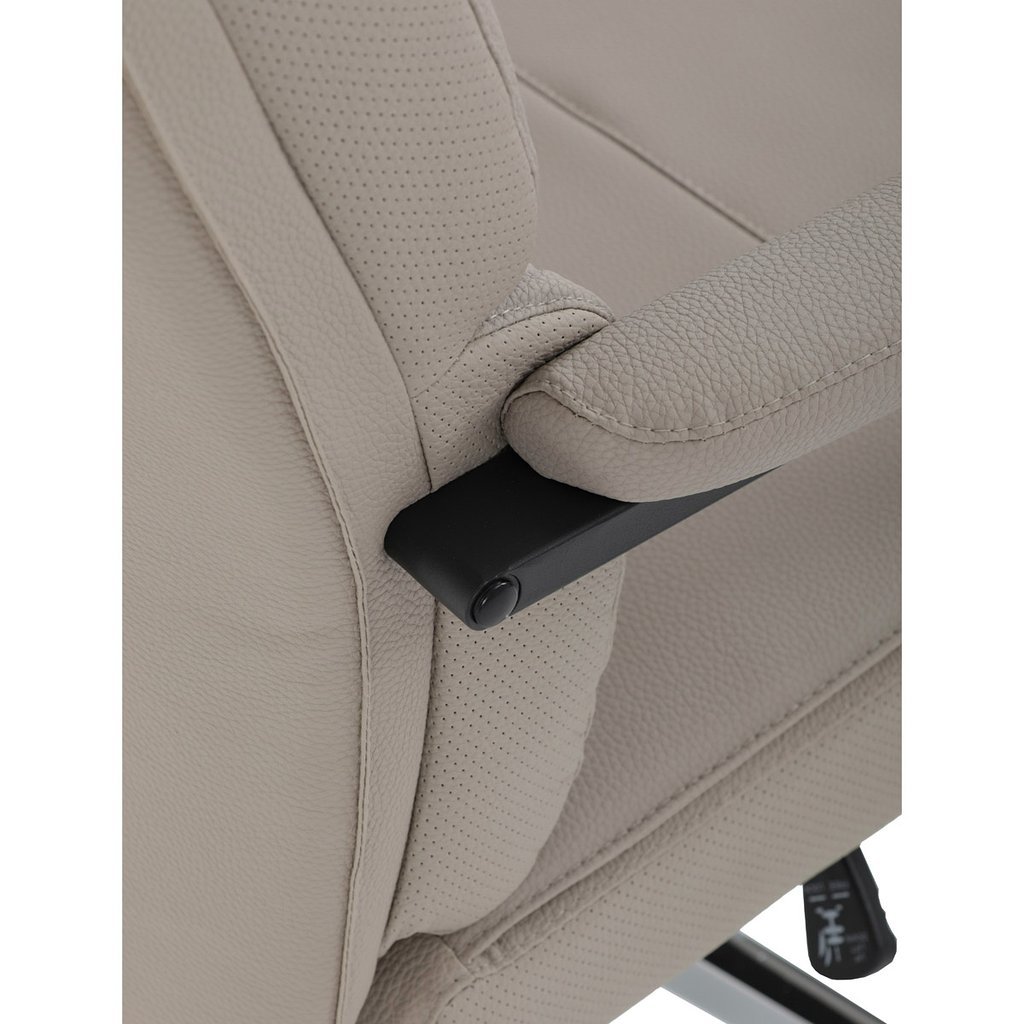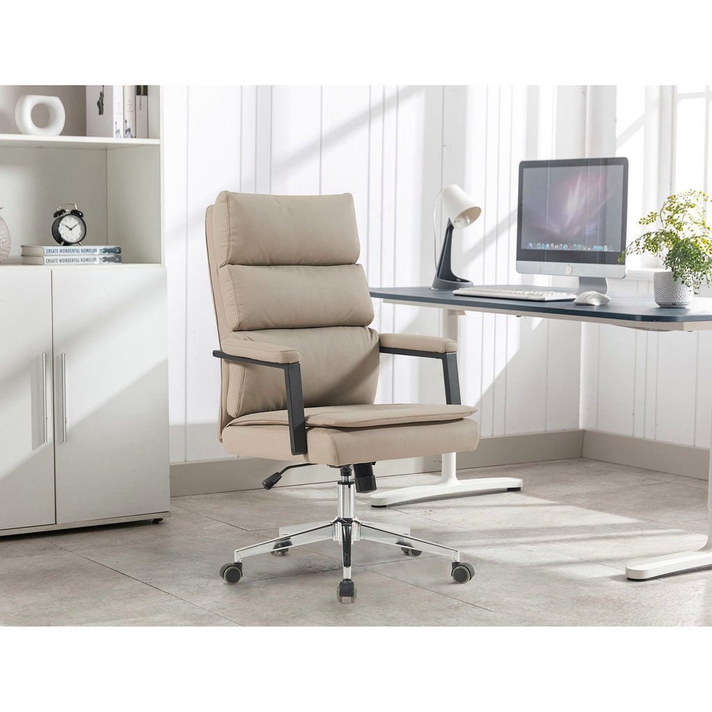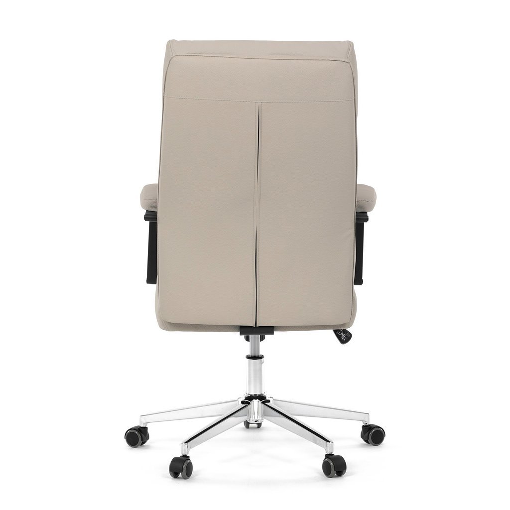 Kancelárske kreslo - AARON v modernom béžovom prevedení je ideálnym spojením elegancie a pohodlia. Tento kus nábytku, vyrobený z kvalitnej ekokože, ponúka luxusný vzhľad, ktorý skvele doladí vašu kanceláriu alebo pracovný priestor. Vysoké polstrovanie sedadla a operadla zabezpečuje maximálny komfort pri dlhodobom sedení, pričom čalúnené podrúčky s vymäkčenou vrchnou časťou poskytujú oporu pre vaše ruky.