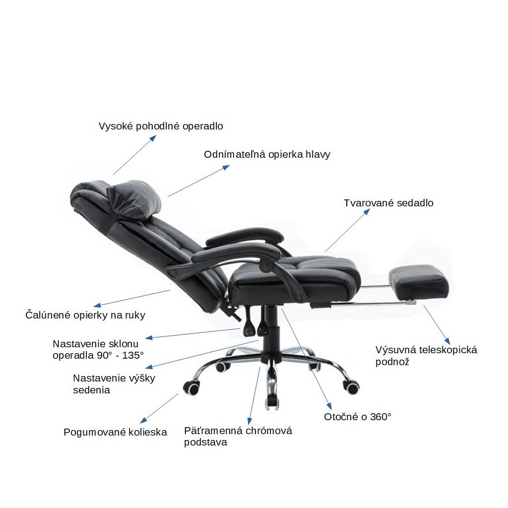 Kancelárske kreslo ARNAUD v čiernej ekokoži kombinuje štýlový dizajn a pohodlie. S polohovateľným operadlom, výsuvnou podnožou a mechanizmom výšky sedu je ideálne do každej kancelárie.