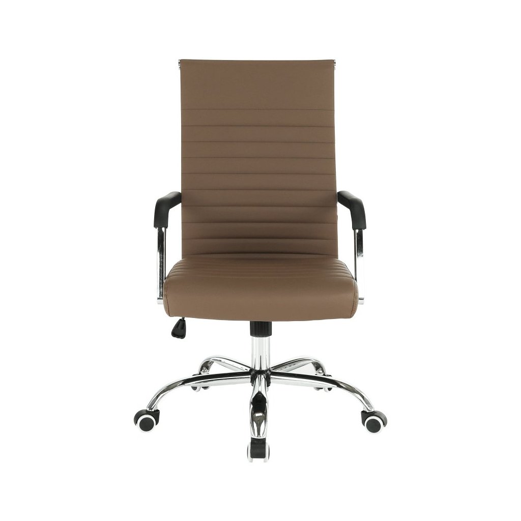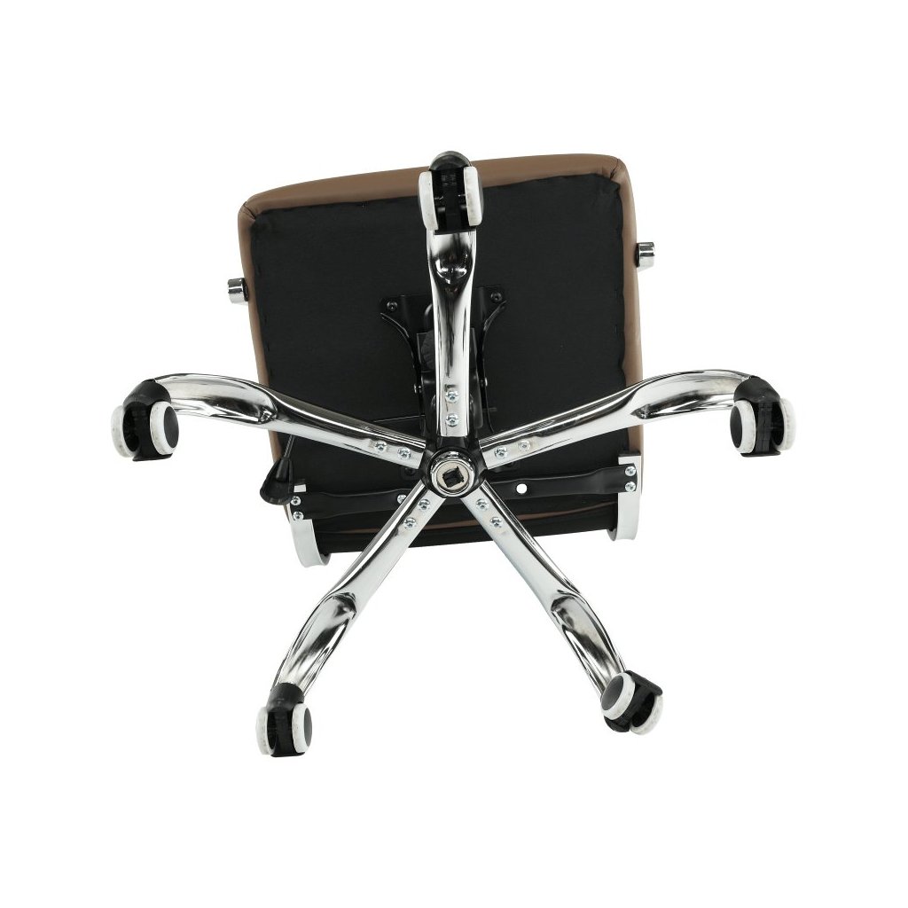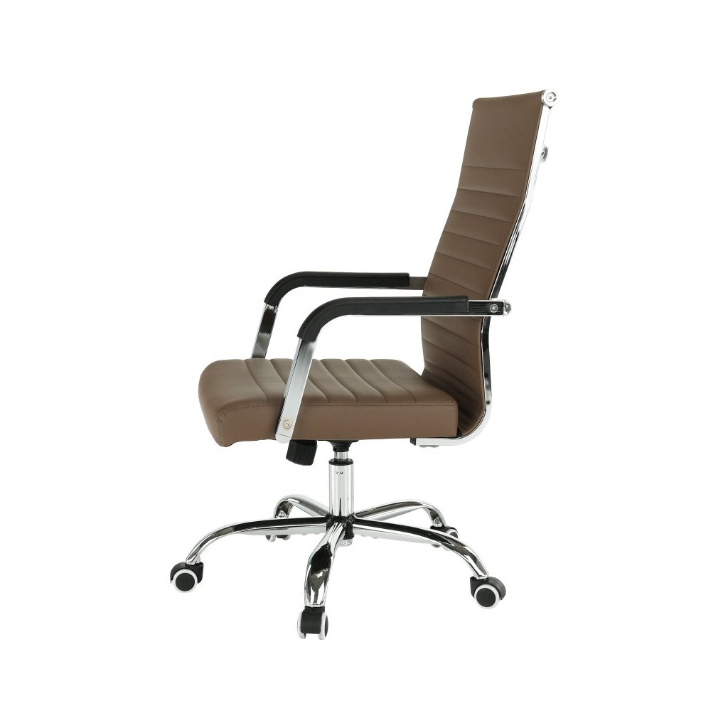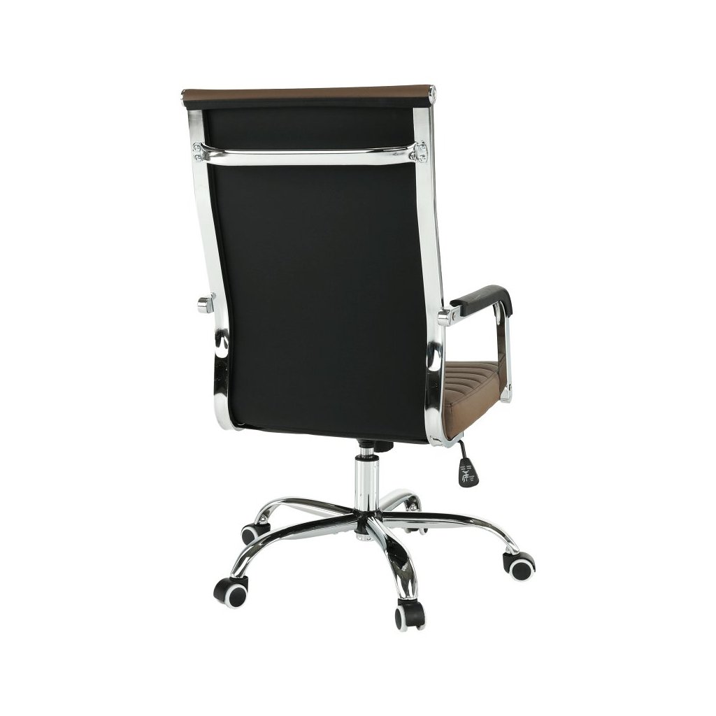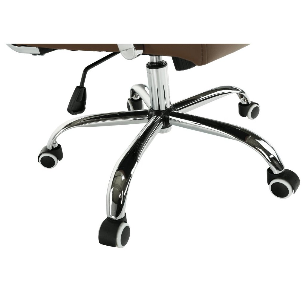 Kancelárske kreslo FARAN v hnedé ekokoži spája štýl a pohodlie. S pogumovanými kolieskami je ideálne na plávajúce aj drevené podlahy. Nastaviteľná výška a elegantný chrómový rám.