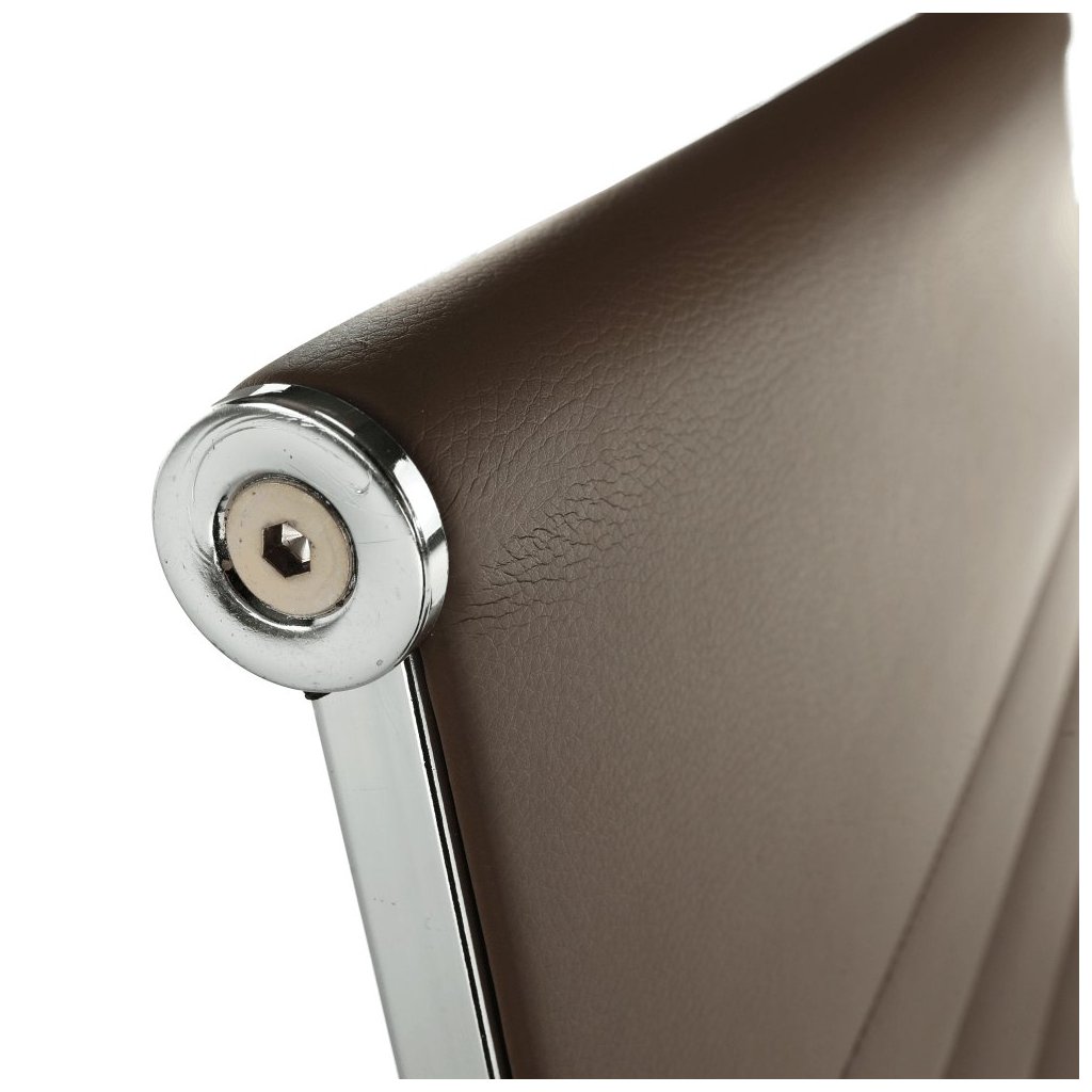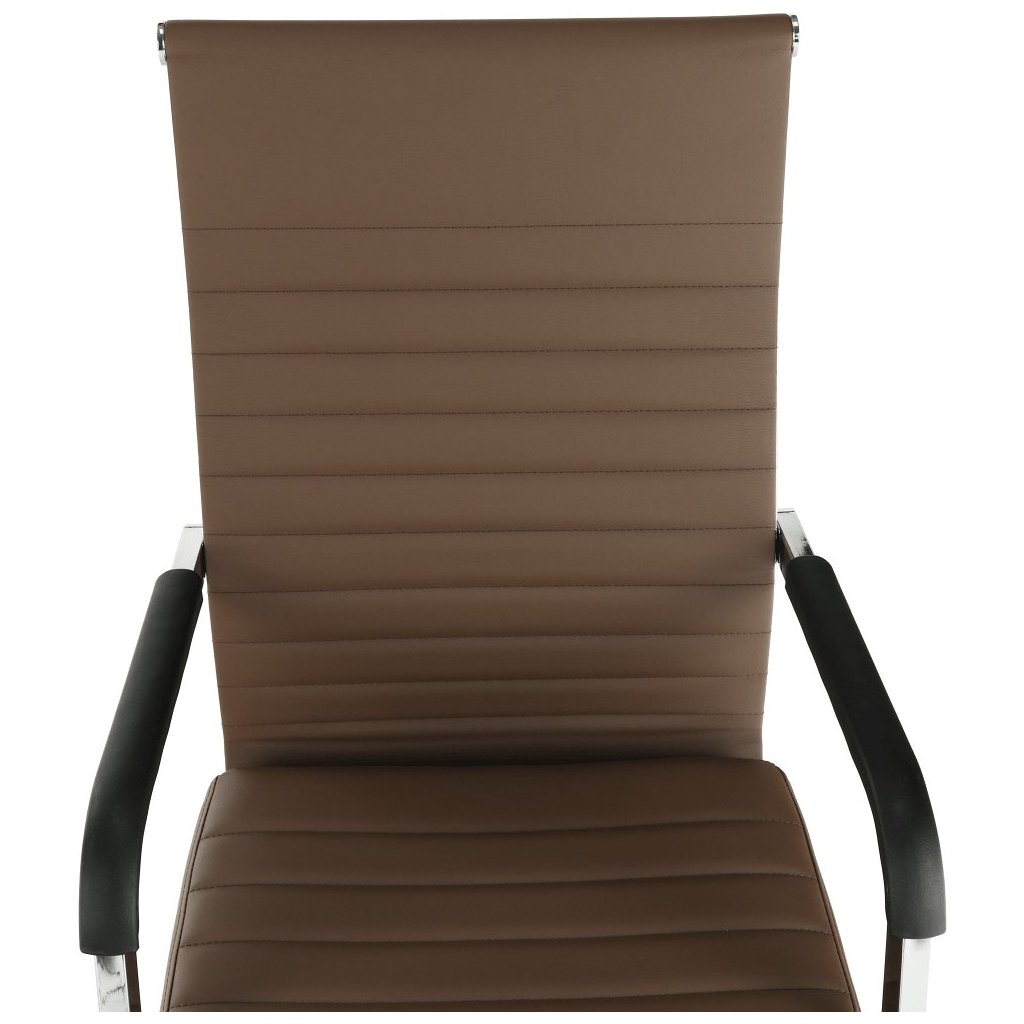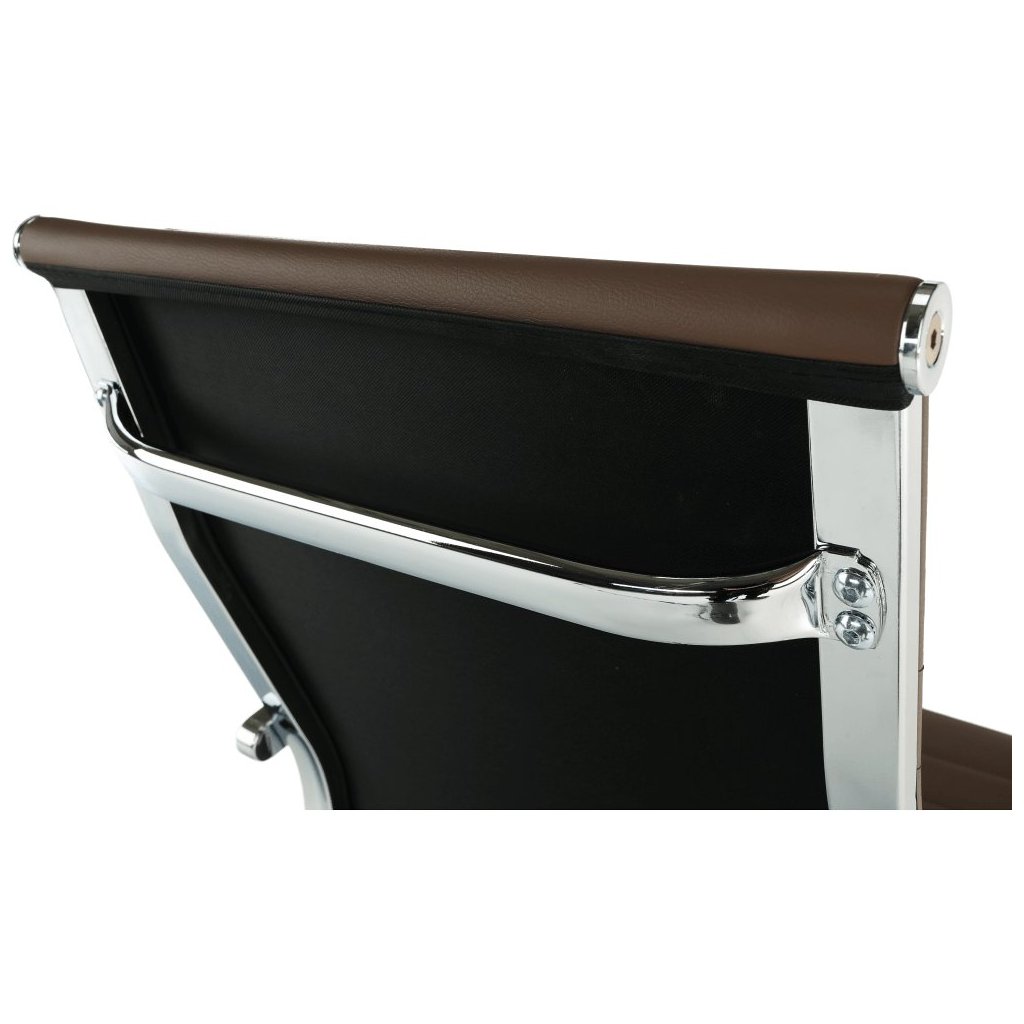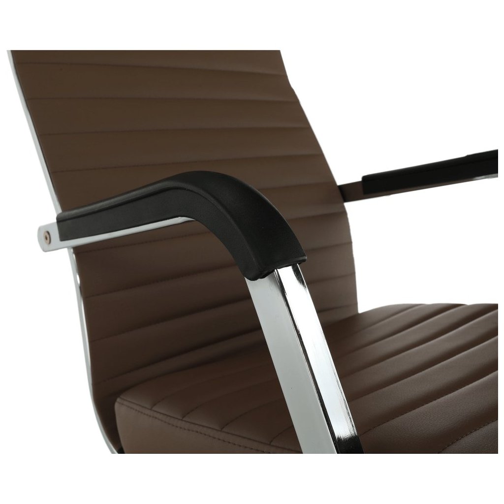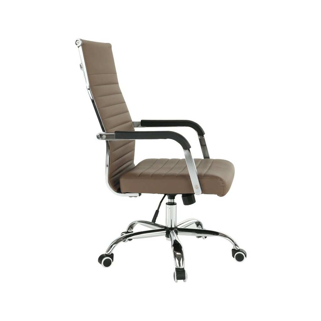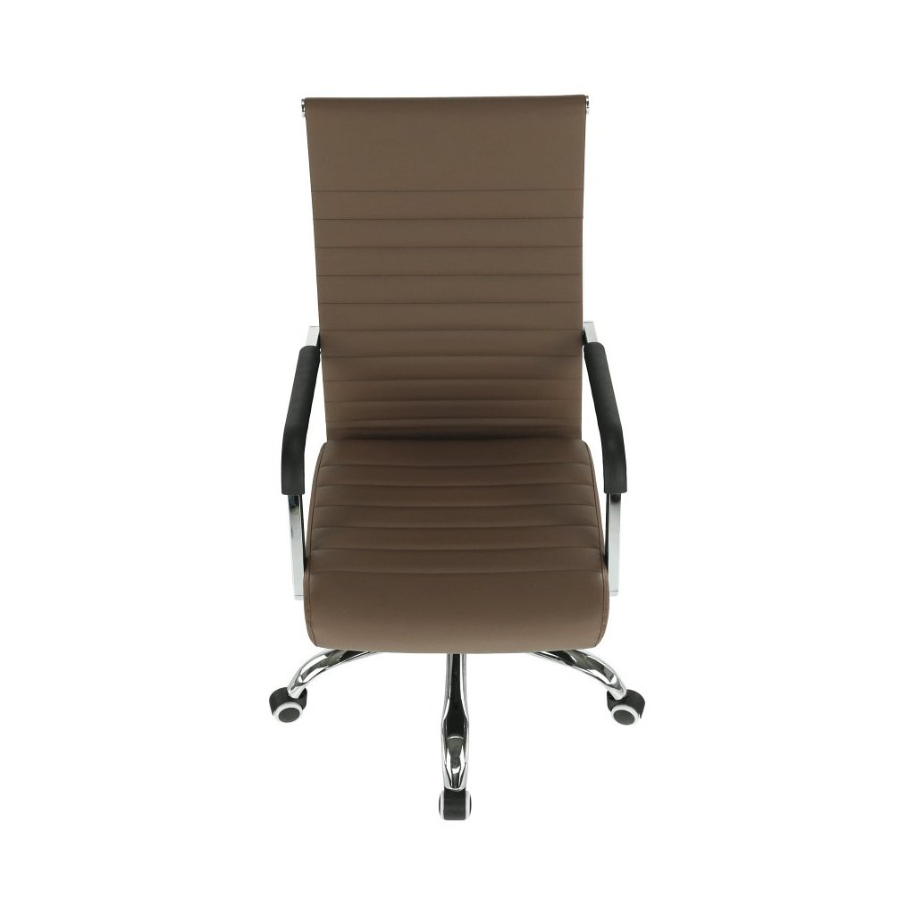 Kancelárske kreslo FARAN v hnedé ekokoži spája štýl a pohodlie. S pogumovanými kolieskami je ideálne na plávajúce aj drevené podlahy. Nastaviteľná výška a elegantný chrómový rám.