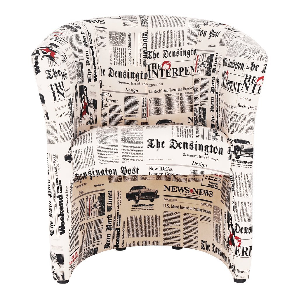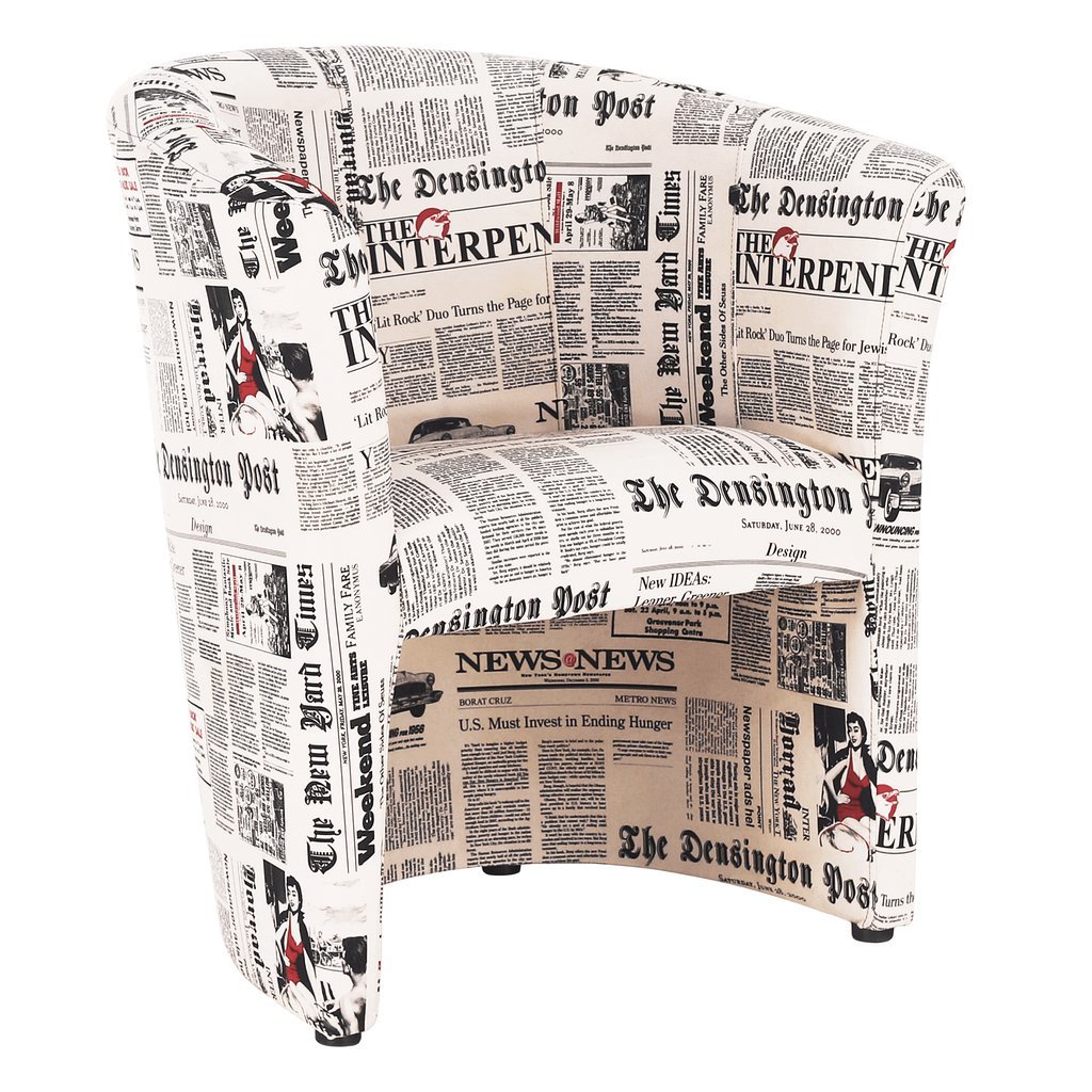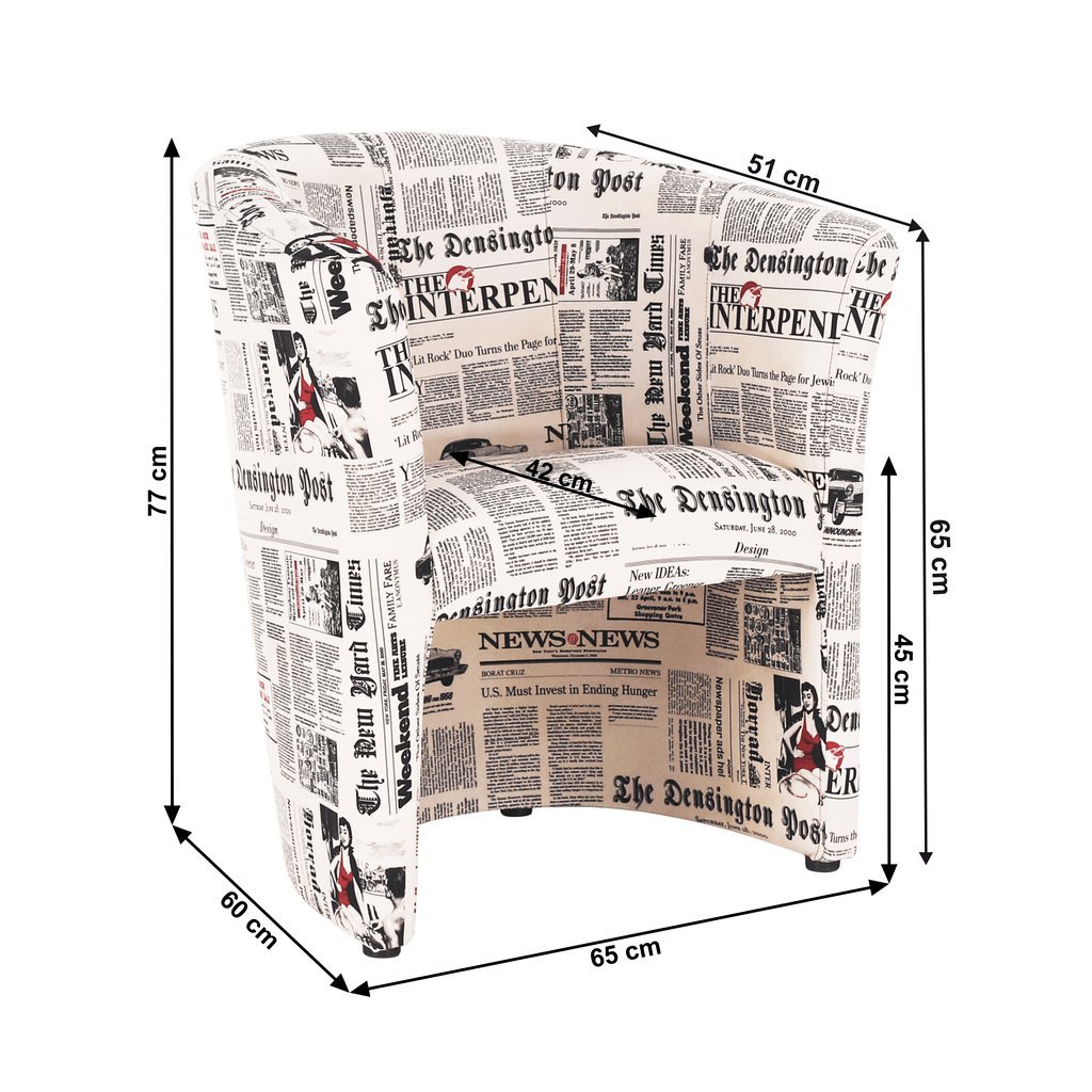 Klubové kreslo CUBA s vzorom novín oživí váš interiér. Praktické a pohodlné s purpenovou výplňou. Rozmery: 65x60x77 cm, výška sedu 45 cm. Dodávané v monte. Hmotnosť: 11,2 kg.