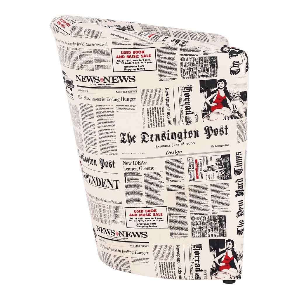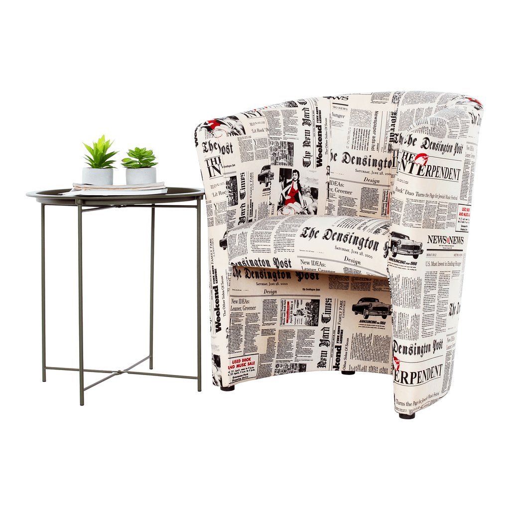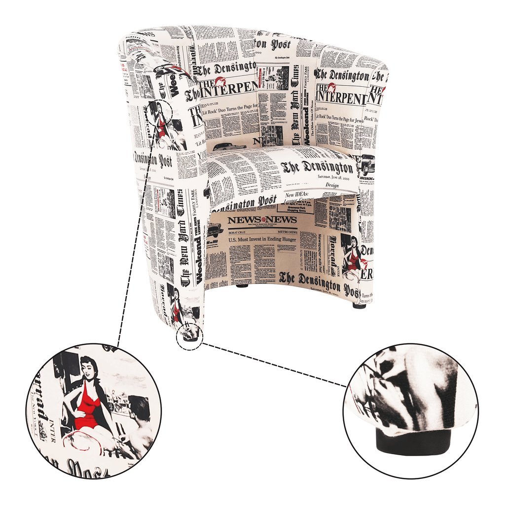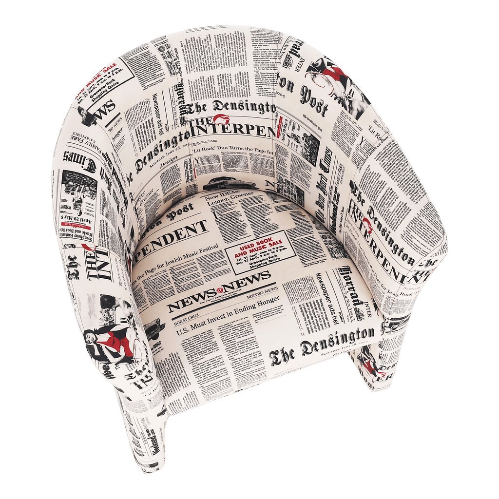 Klubové kreslo CUBA s vzorom novín oživí váš interiér. Praktické a pohodlné s purpenovou výplňou. Rozmery: 65x60x77 cm, výška sedu 45 cm. Dodávané v monte. Hmotnosť: 11,2 kg.