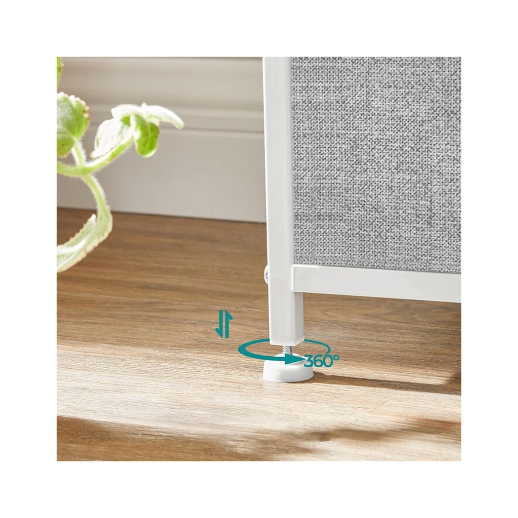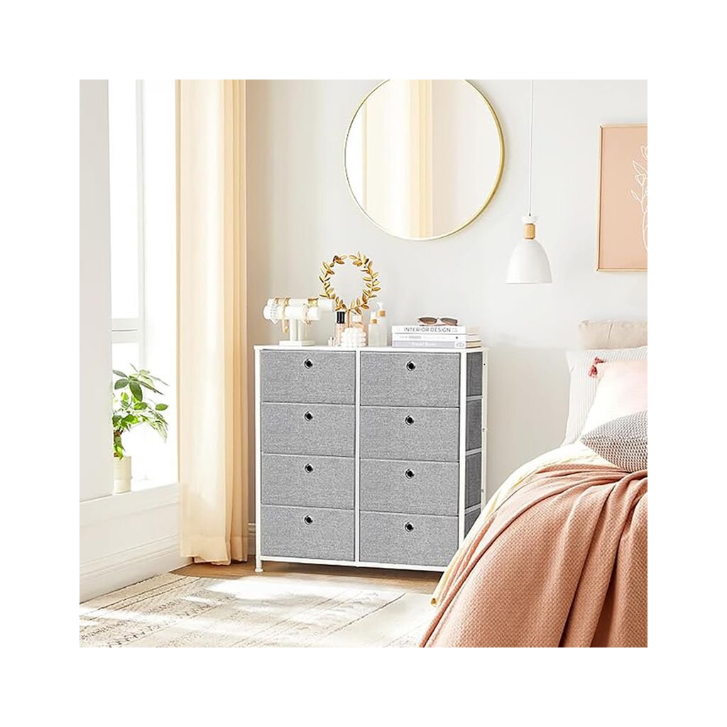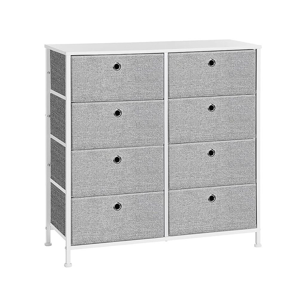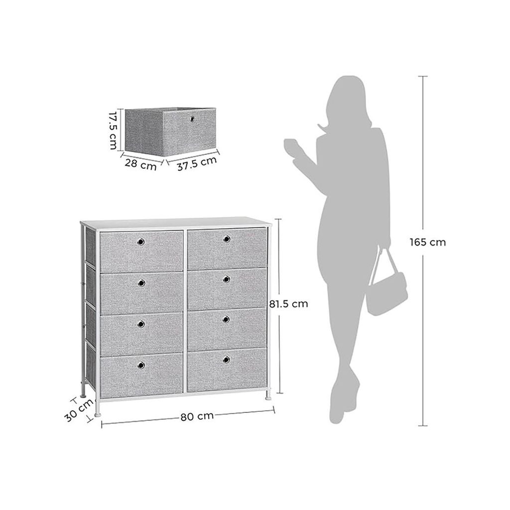 Vyrobená z kvalitných materiálov, komoda ponúka kombináciu pevných kovových konštrukcií s elegantnou MDF doskou. Osem praktických zásuviek poskytuje dostatok miesta na uskladnenie drobností, pričom látkový materiál dodáva vzdušnosť a ľahký vzhľad.