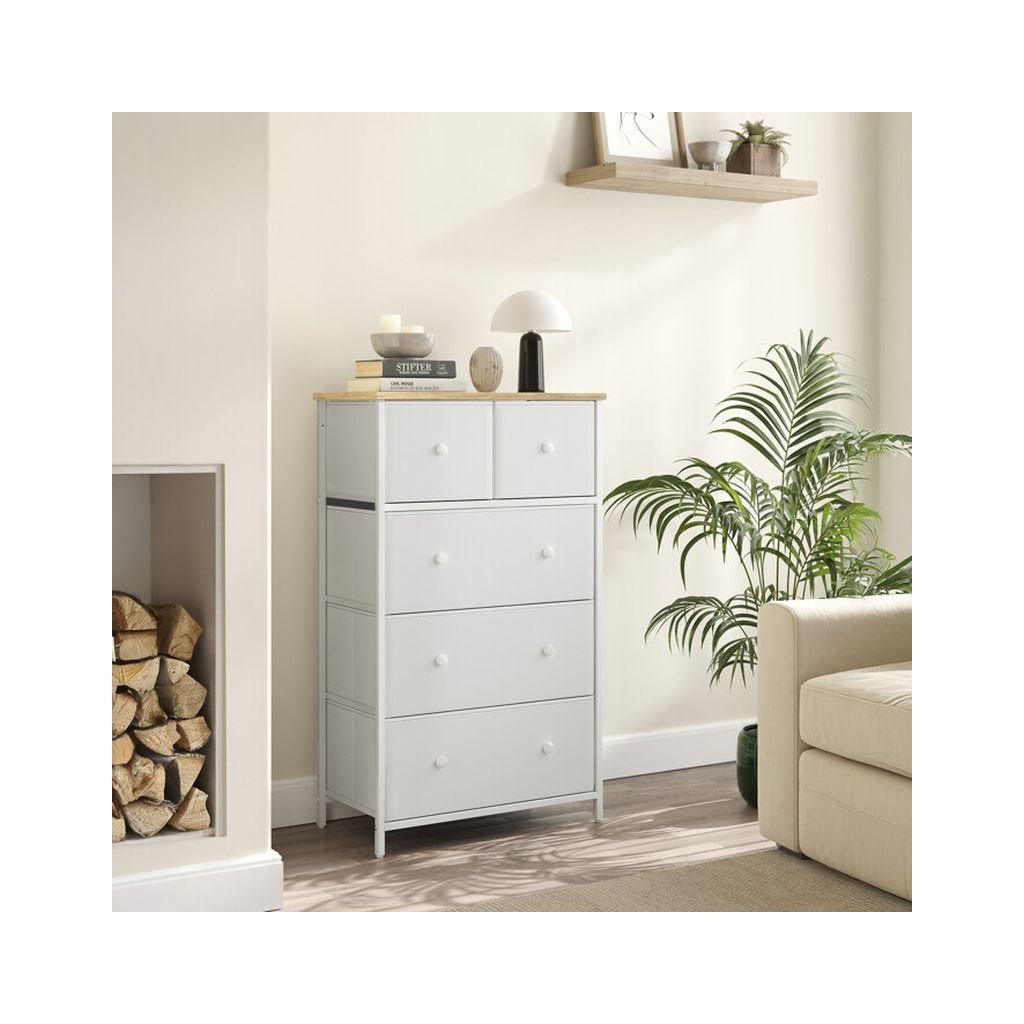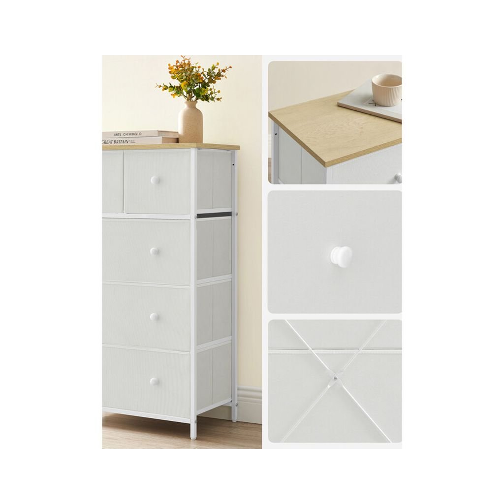 Komoda HERTA v bielej farbe s rozmermi 56x30x93 cm ponúka štyri priestranné látkové zásuvky a stabilnú kovovú konštrukciu, ideálna pre moderné aj klasické interiéry.