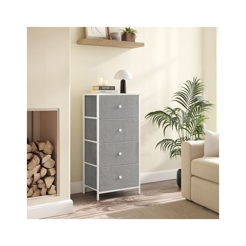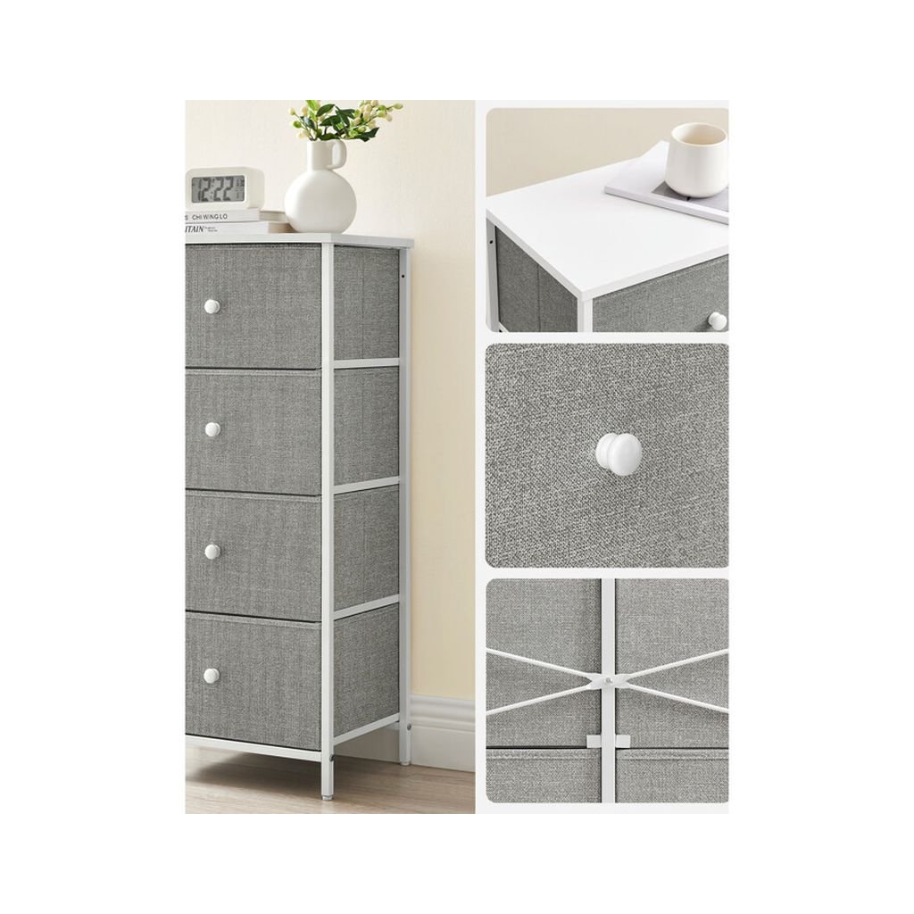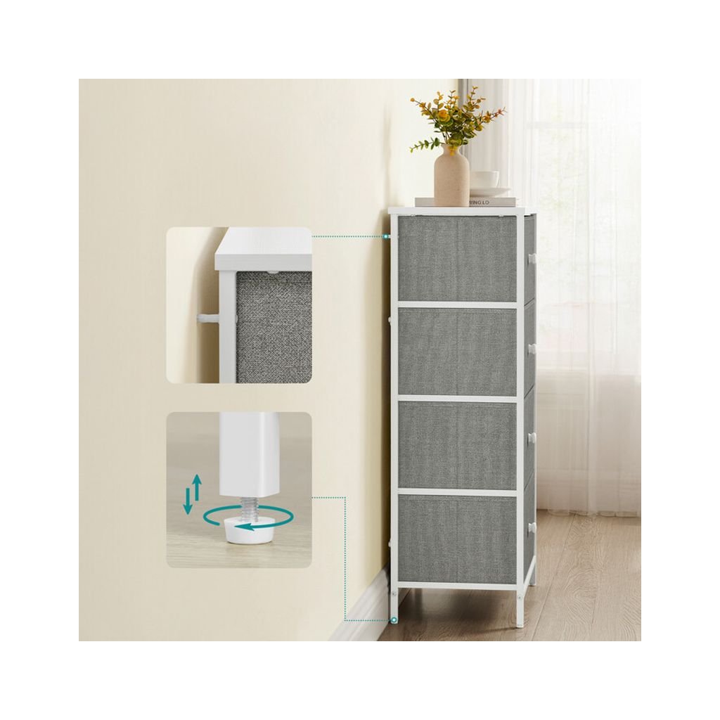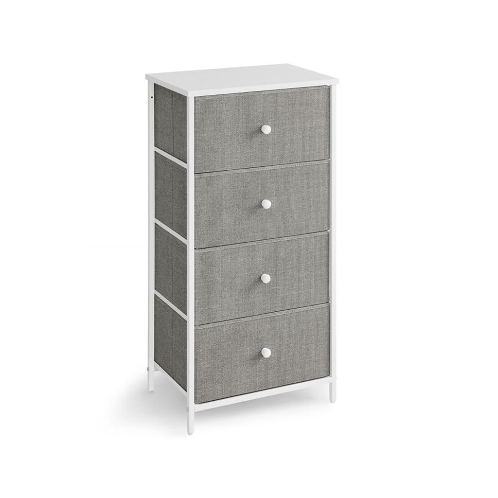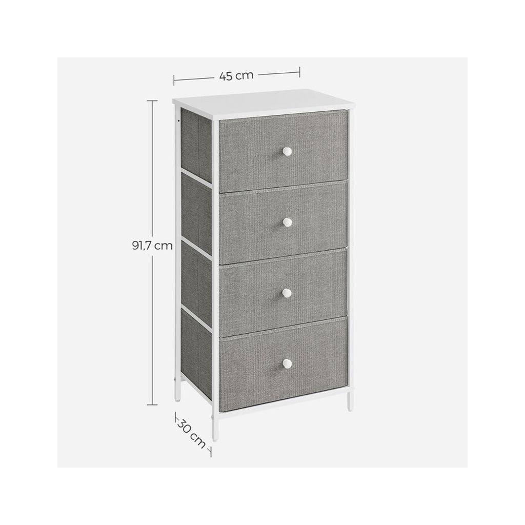 Sivá komoda s rozmermi 45x30x92 cm ponúka štyri priestranné zásuvky z textílie, stabilnú kovovú konštrukciu a moderný dizajn, ideálna do menších priestorov.