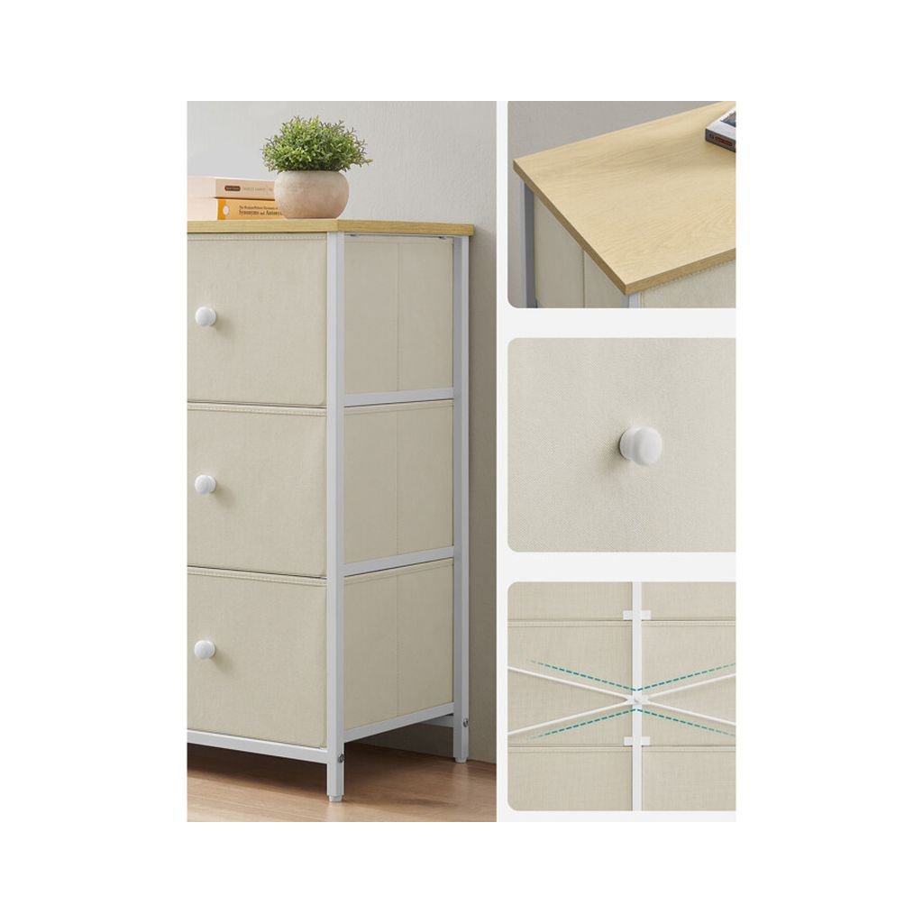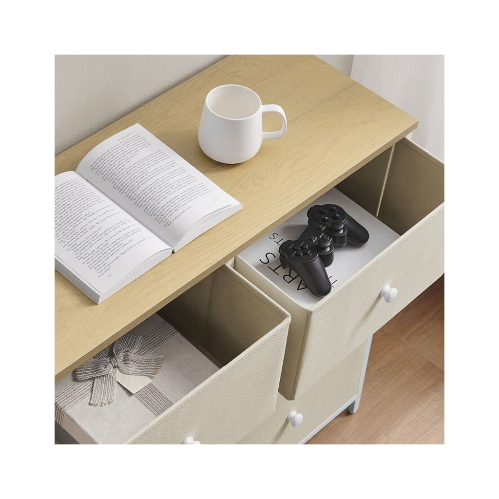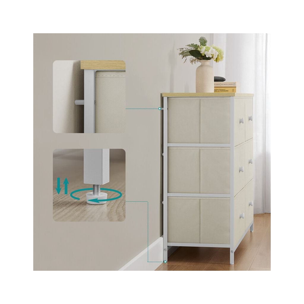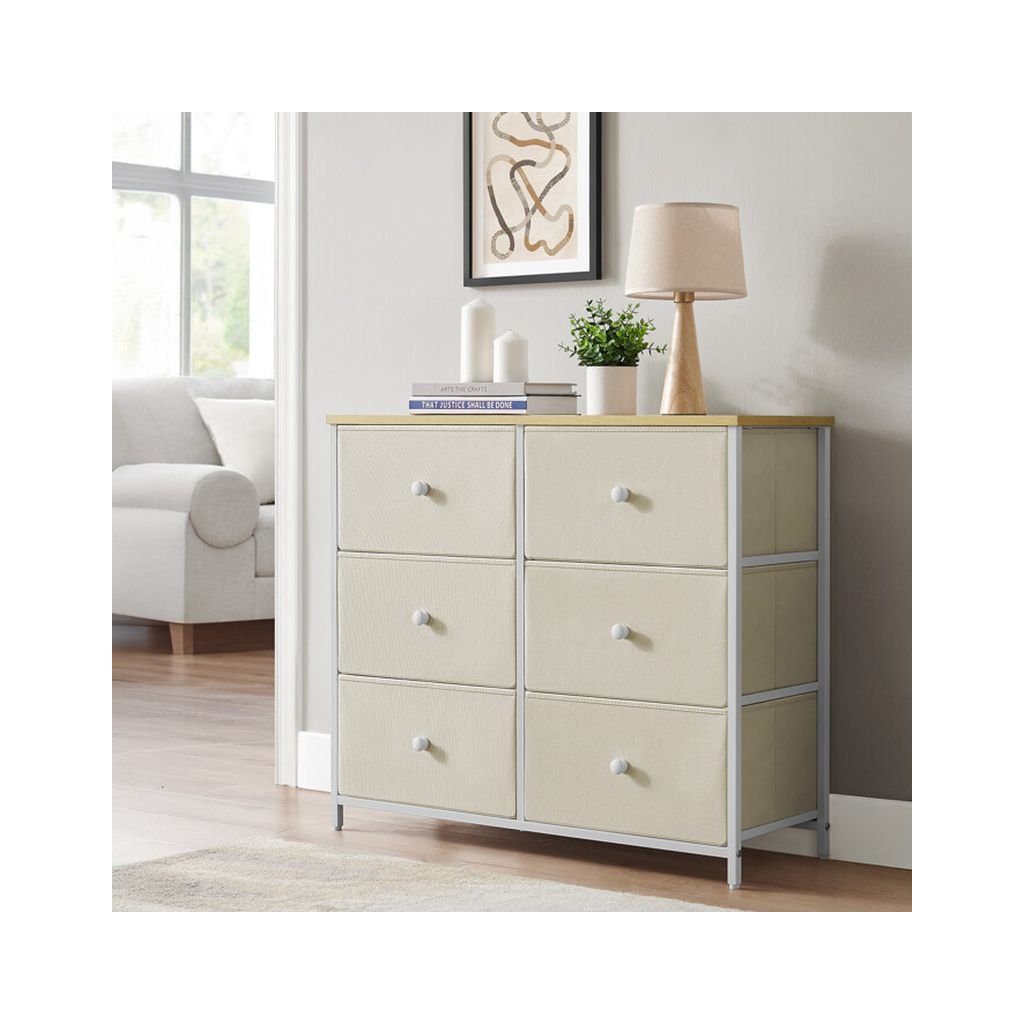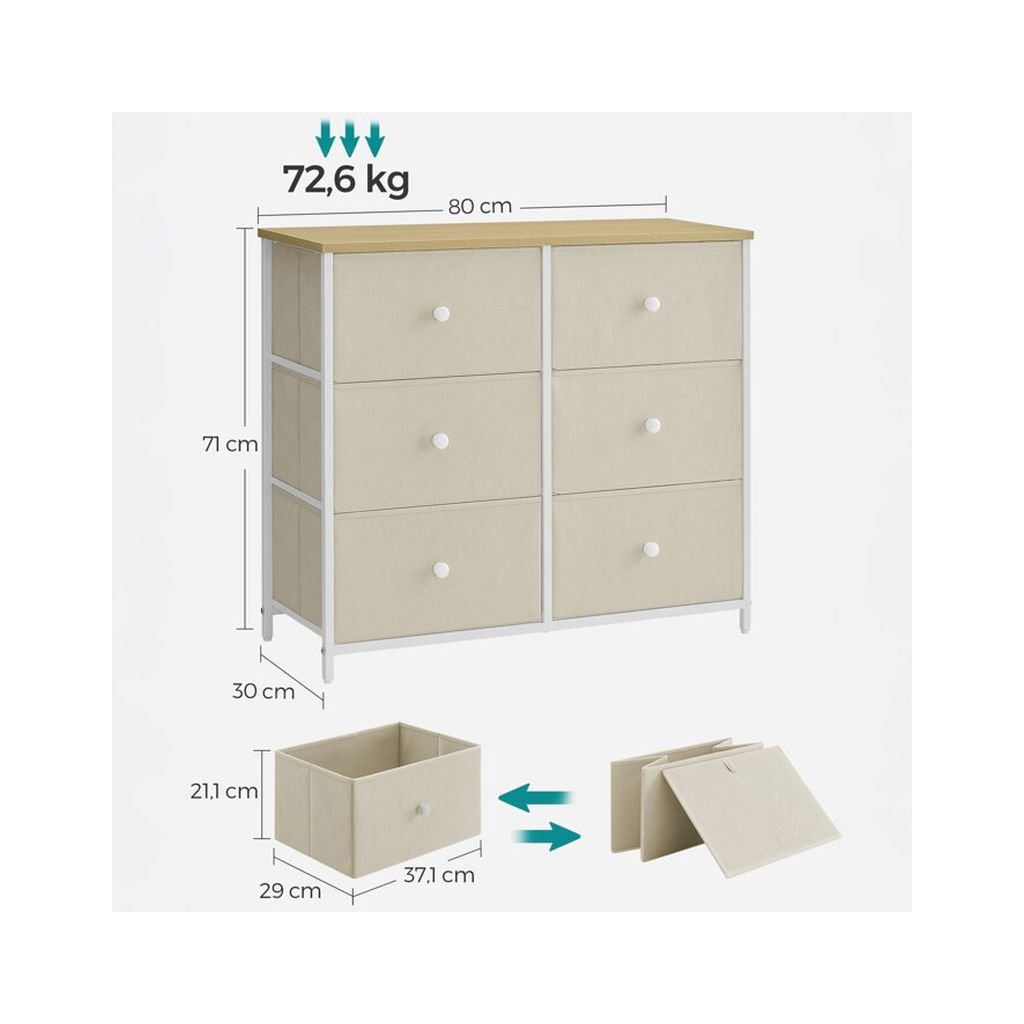 Jej šesť priestranných zásuviek z netkanej textílie poskytuje ideálne miesto na uskladnenie rôznych drobností, zatiaľ čo robustná konštrukcia zabezpečuje dlhú životnosť a stabilitu. Táto komoda je skvelou voľbou pre moderné aj minimalistické priestory.