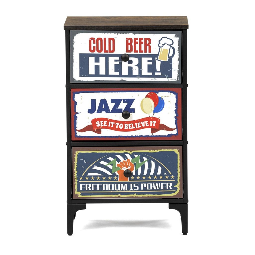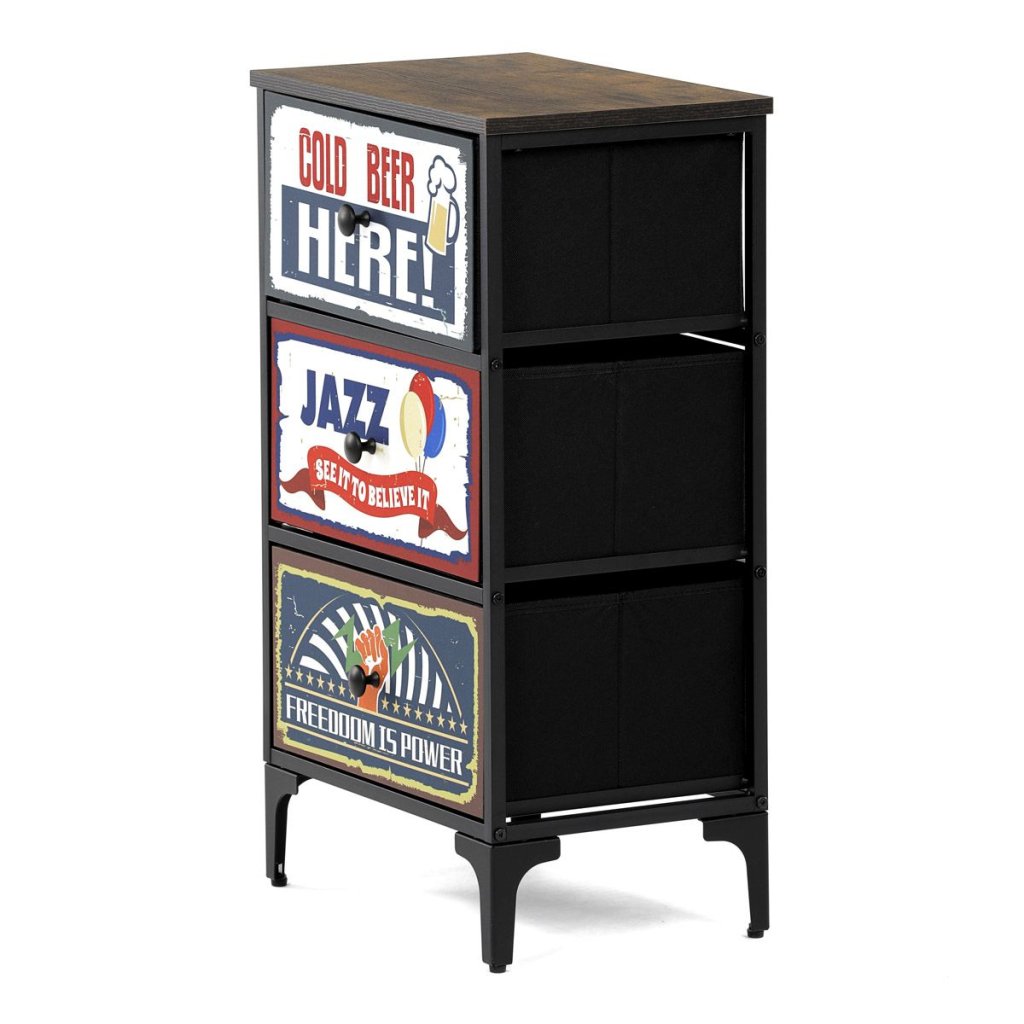 Komoda ILAN v čiernej farbe spojuje retro štýl s modernými prvkami. Jej textilné čelá a vintage potlač evokujú atmosféru jazzových klubov, zatiaľ čo robustná konštrukcia pridáva eleganciu. Ideálna do