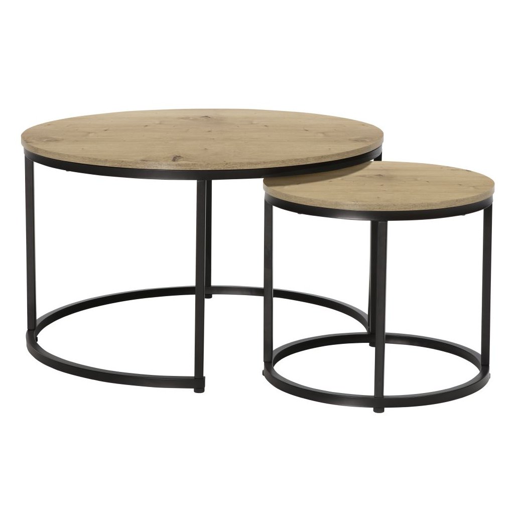 Set pozostávajúci z dvoch okrúhlych stolíkov ponúka nie len funkčnosť, ale aj moderný dizajn. Ich robustná konštrukcia z DTD laminovanej dosky a kovu zabezpečuje dlhú životnosť a nosnosť až 40 kg.