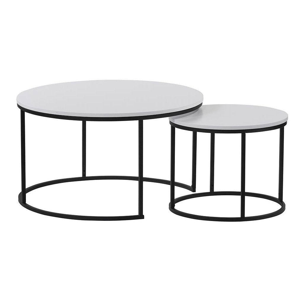 Set dvoch konferenčných stolíkov v bielej a čiernej farbe. Vyrobené z MDF a kovu, s väčším stolíkom o priemere 80 cm a menším 50 cm. Nosnosť 30 kg. Dodávané v demonte.