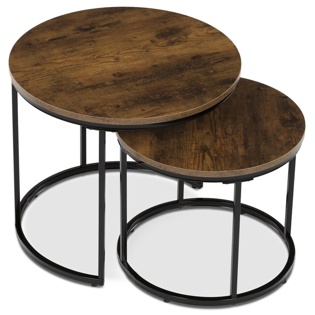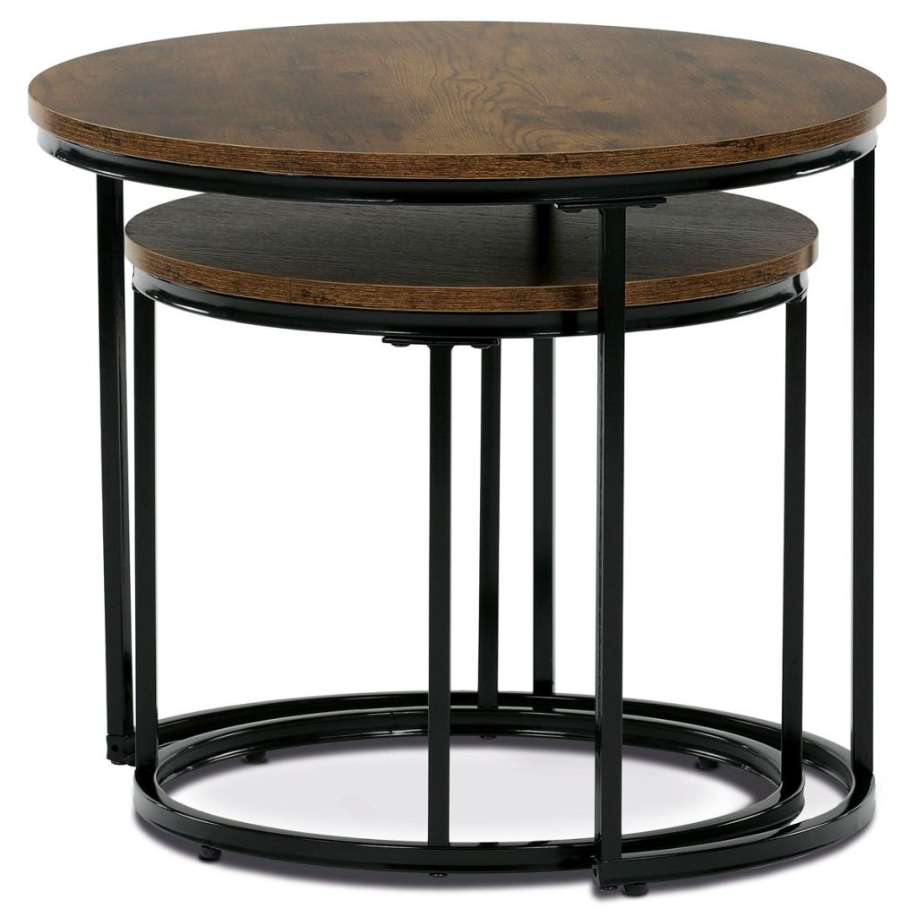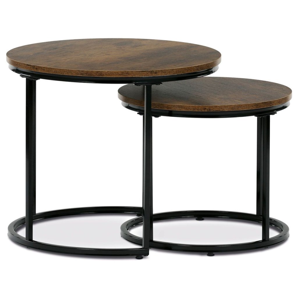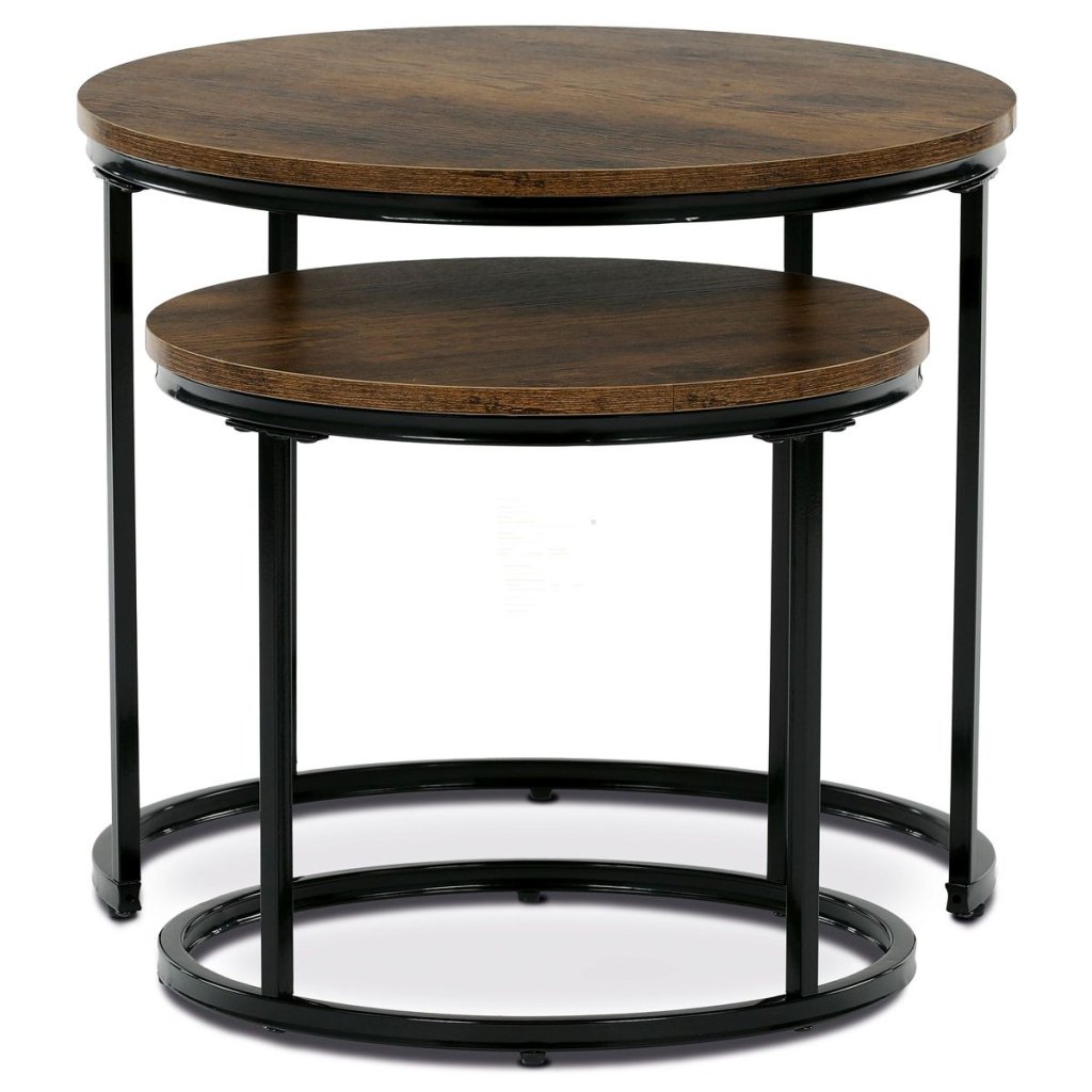 Set dvoch konferenčných stolíkov v industriálnom štýle kombinuje praktickosť a moderný dizajn. Okrúhle dosky v dekore starého dreva dopĺňajú čierne kovové nohy, ktoré zabezpečujú stabilitu. Stolíky je