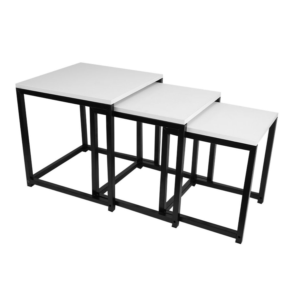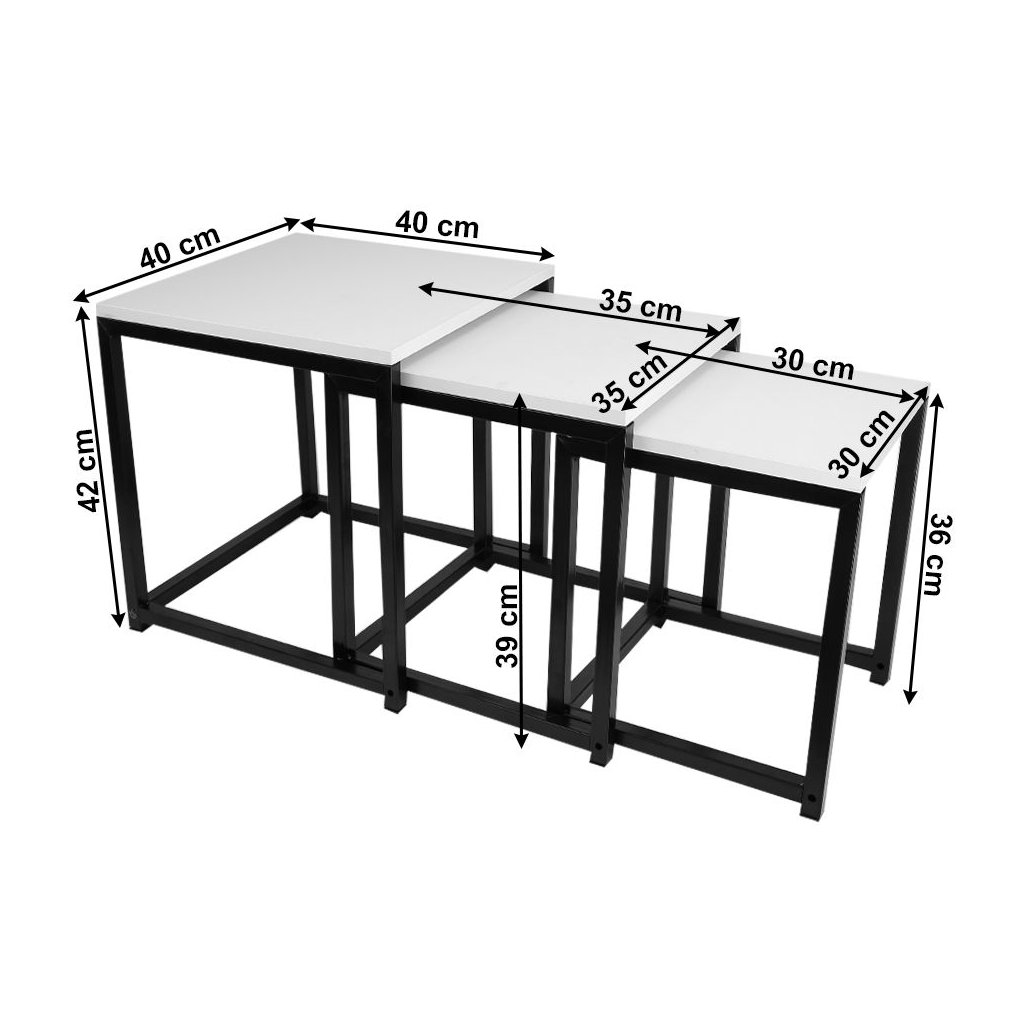 Set 3 konferenčných stolíkov v bielej matnej a čiernej farbe. Vyrobené z MDF a kovu, s rozmermi od 30 do 40 cm. Praktické a moderné, ideálne do každého interiéru. Dodávané v demonte.