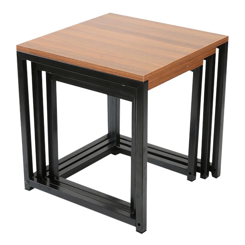 Set troch konferenčných stolíkov v elegantnej kombinácii orechovej a čiernej farby. Vyrobené z MDF a kovu, dodávané v demonte. Ideálne pre moderné interiéry. Rozmery: 40x40x42 cm, 35x35x39 cm, 30x30x3