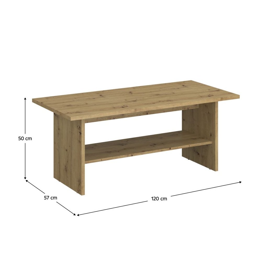 Konferenčný stolík AIRON v dekore dub artisan ponúka moderný dizajn a praktický odkladací priestor. Rozmery 120x57x50 cm, nosnosť police 5 kg. Dodávaný v demonte.