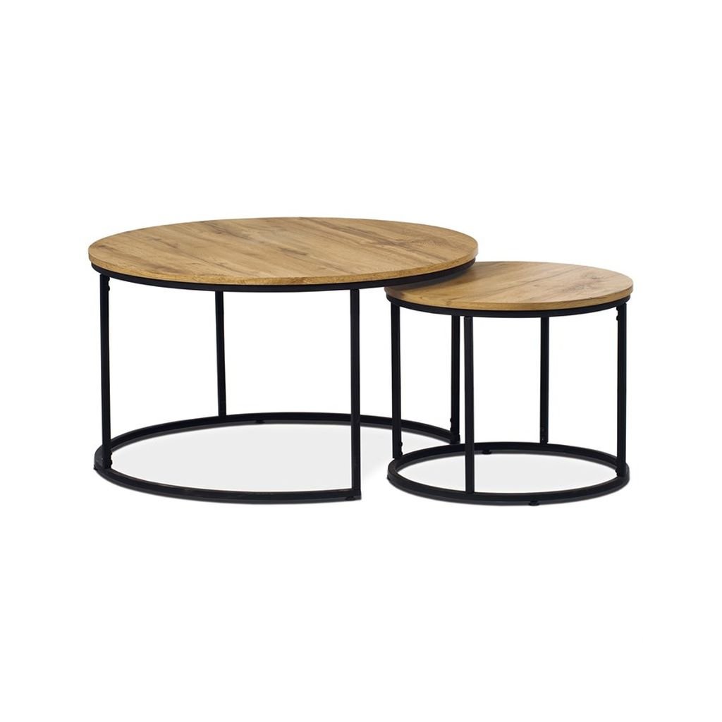 Konferenčný stolík BELORA v dekore divoký dub a čiernej kovovej konštrukcii spojuje praktickosť a nadčasový dizajn. Možnosť zasunutia do seba šetrí priestor. Priemer 80 cm a 50 cm, výška 46 a 41 cm.