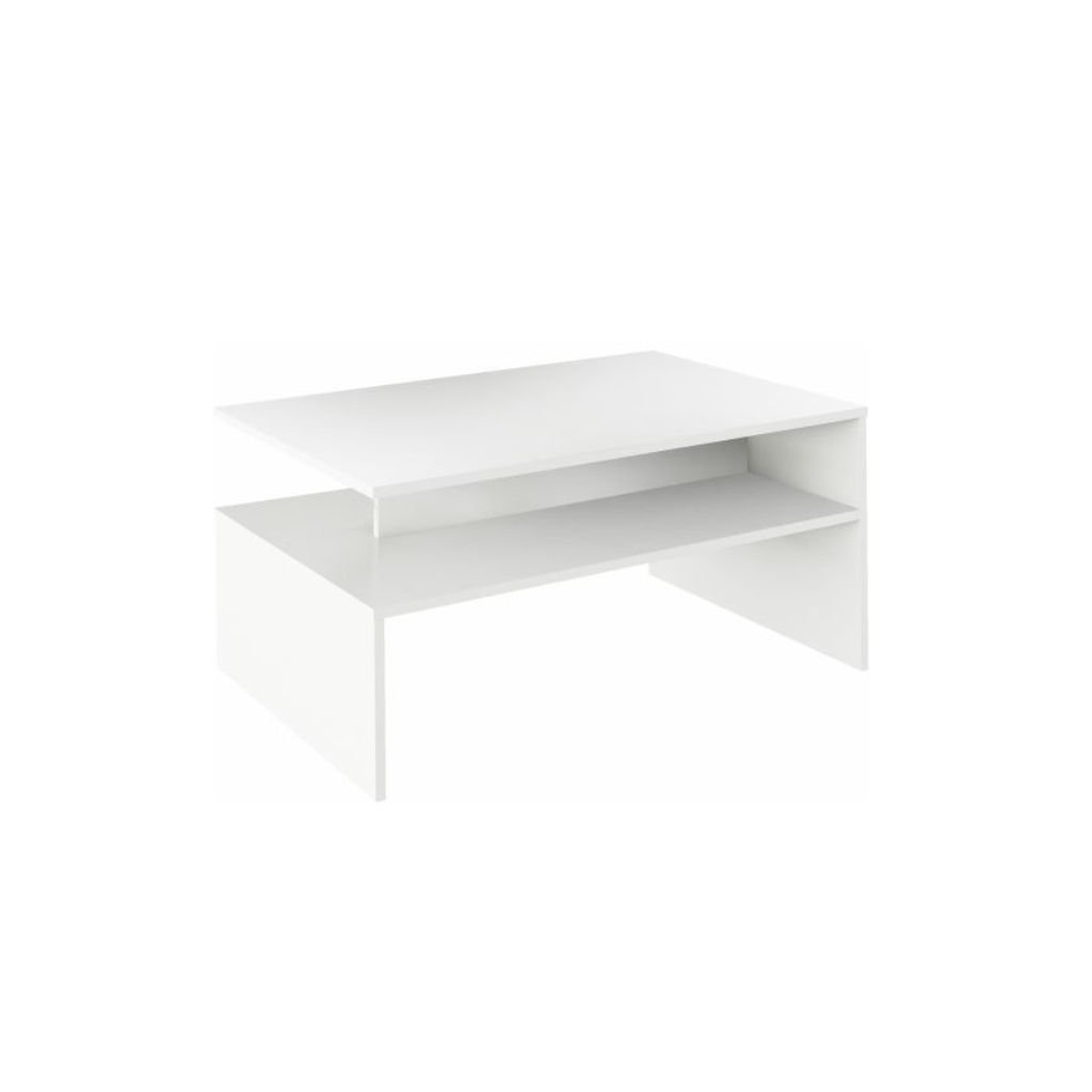 Biely konferenčný stolík s rozmermi 90x60x43 cm z laminovanej DTD. S otvorenou úložnou plochou, hrúbka lamina 16 mm. Dodávaný v demonte, ideálny pre moderné interiéry.