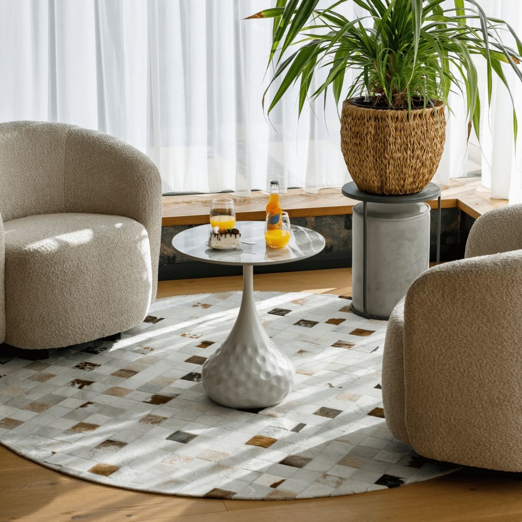 Konferenčný stolík EBREL v bielej farbe je ideálnym doplnkom pre moderné interiéry. Jeho elegantný dizajn a kvalitné materiály robia z tohto stolíka štýlový a praktický kus nábytku, ktorý obohatí vašu obývaciu izbu. Okrúhly tvar a minimalistický vzhľad sú v súlade s aktuálnymi trendmi, čím sa stáva skvelou voľbou pre každého, kto hľadá funkčný a estetický prvok do svojho domova.