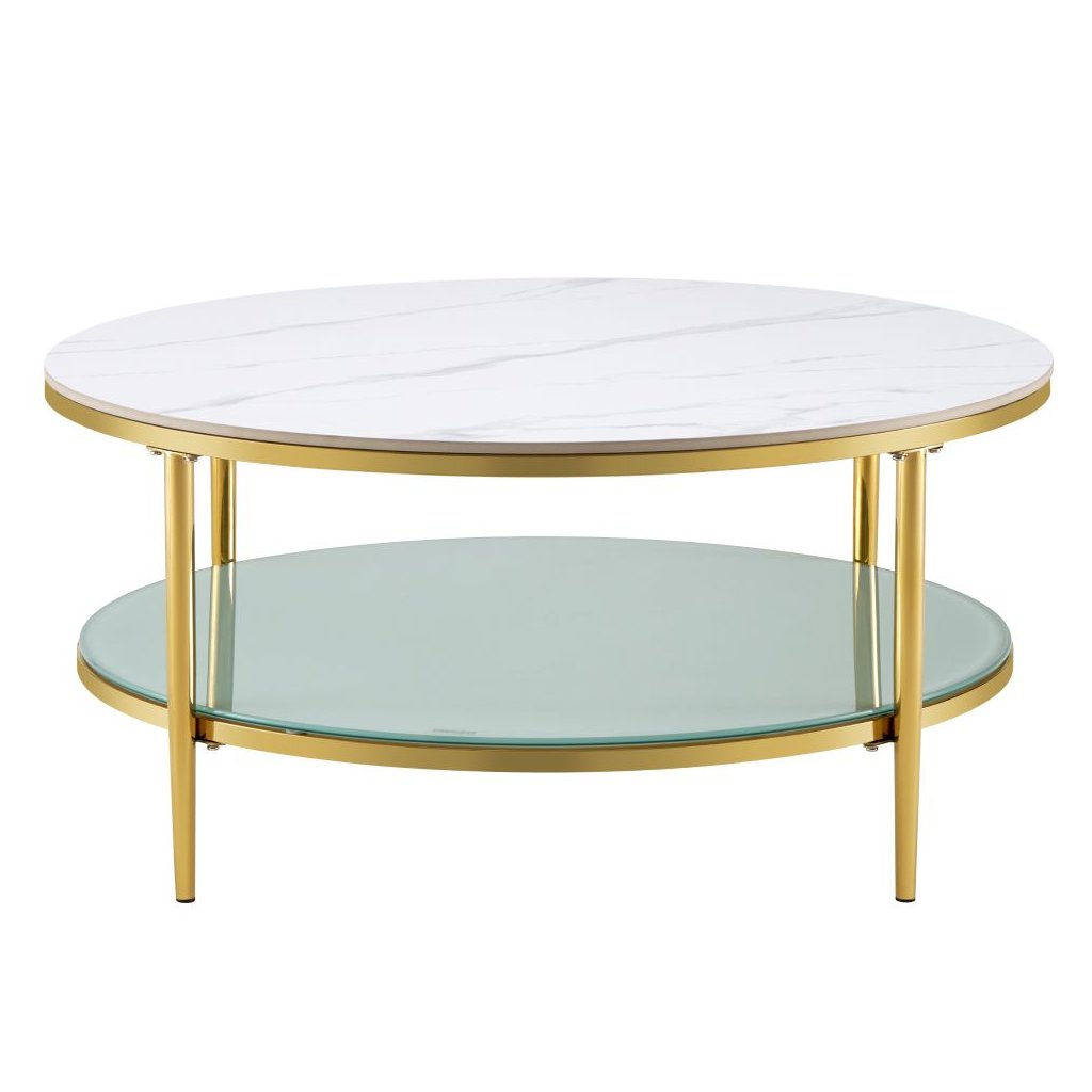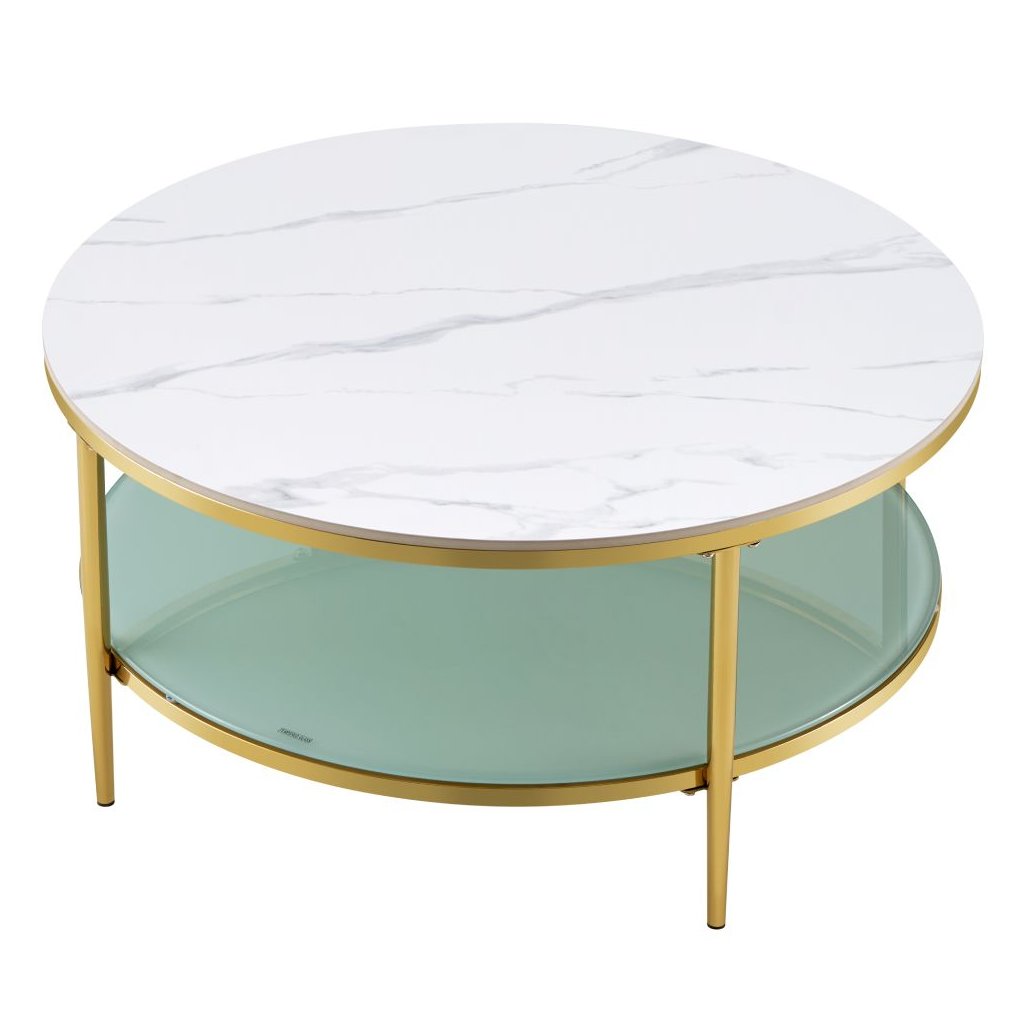 Konferenčný stolík ENION v zlatom prevedení kombinuje oceľ a mramor s moderným dizajnom. Okrúhly tvar a luxusný vzhľad oživí váš interiér. Nosnosť 30 kg, dodávaný v demonte.