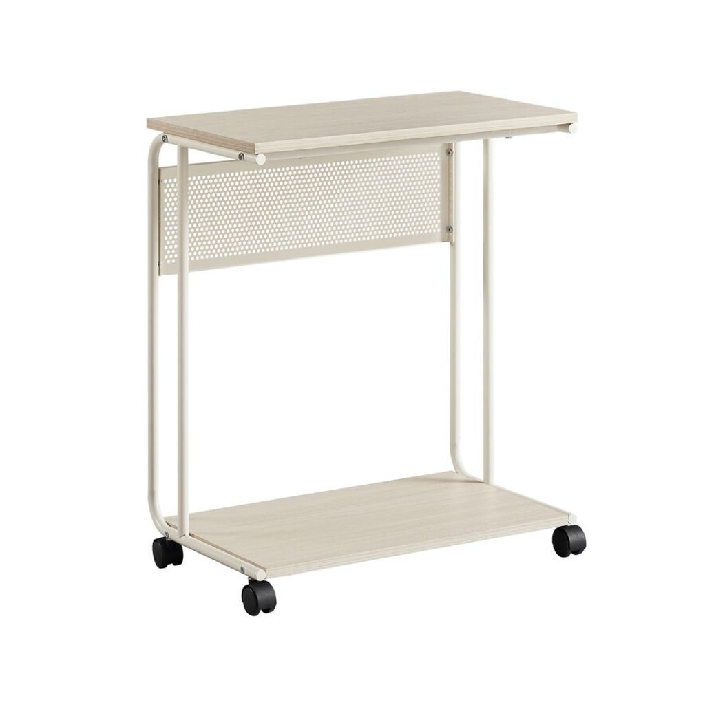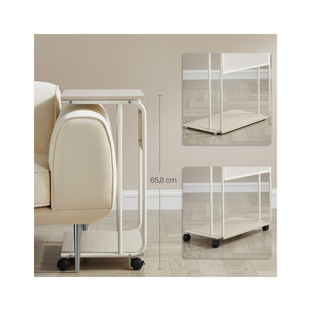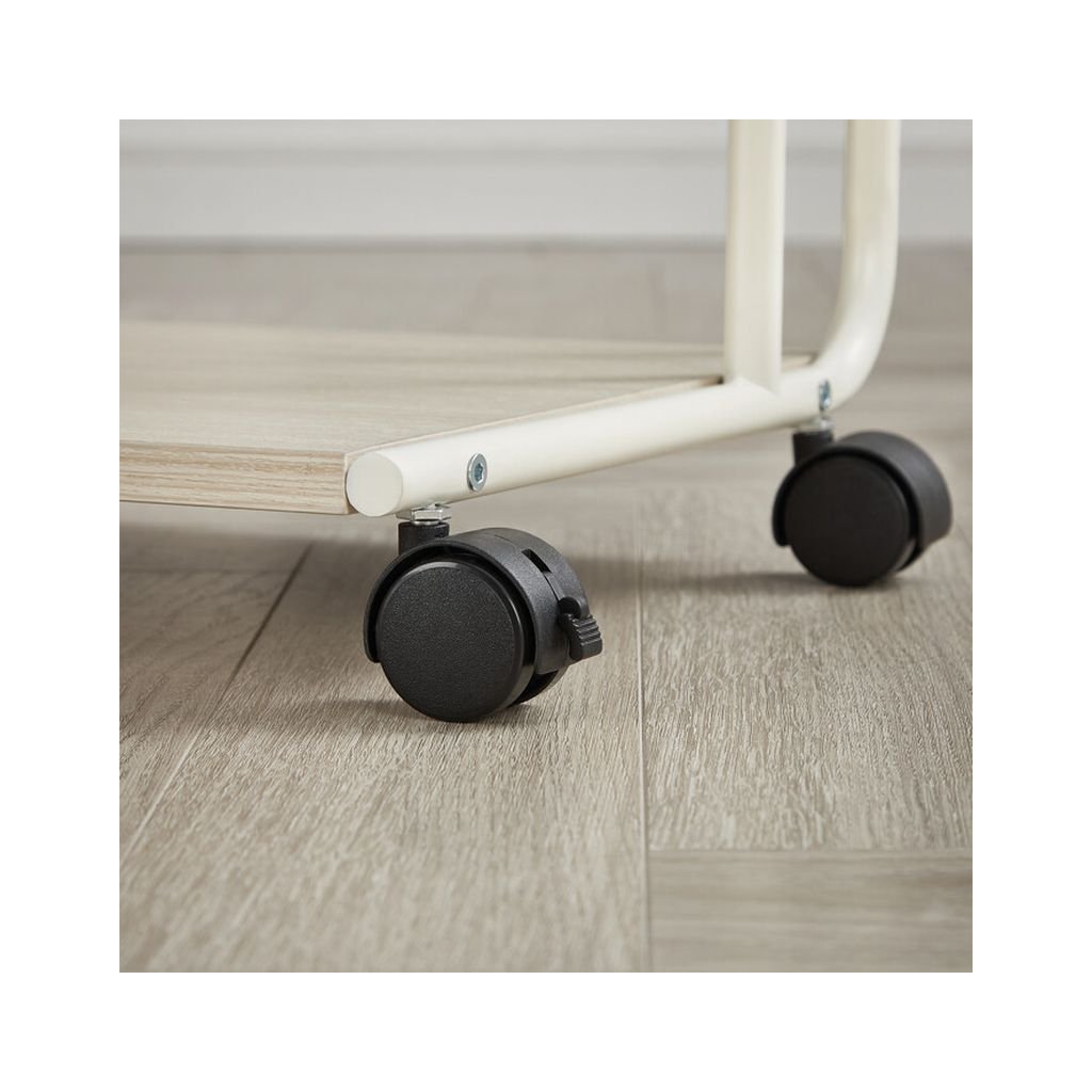 Stolík kombinuje dosku z MDF s dekorom bieleného dubu a pevnú kovovú konštrukciu v bielej farbe, čo zabezpečuje odolnosť a jednoduchú údržbu. Vďaka štyrom kolieskam sa ľahko presúva a prispôsobí sa tak vašim potrebám.