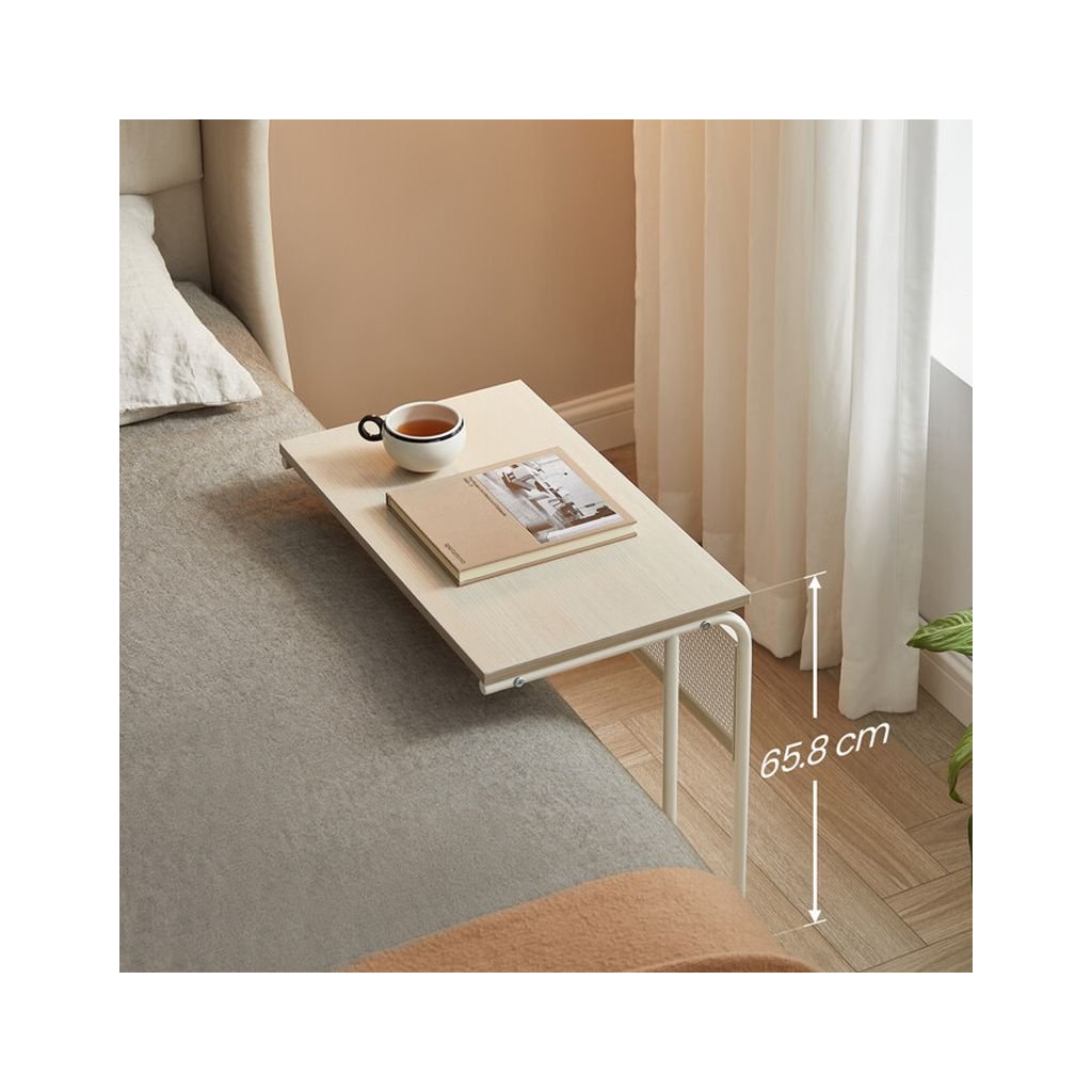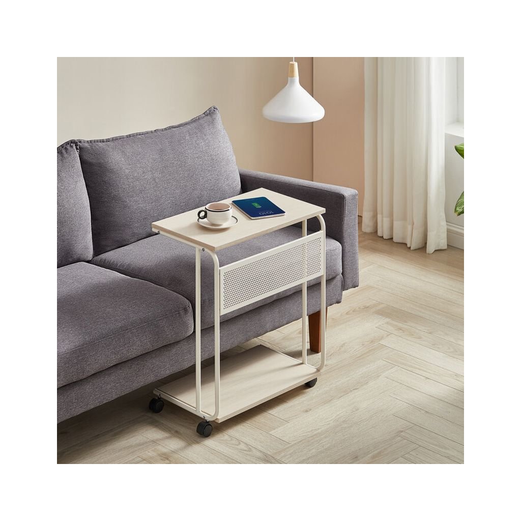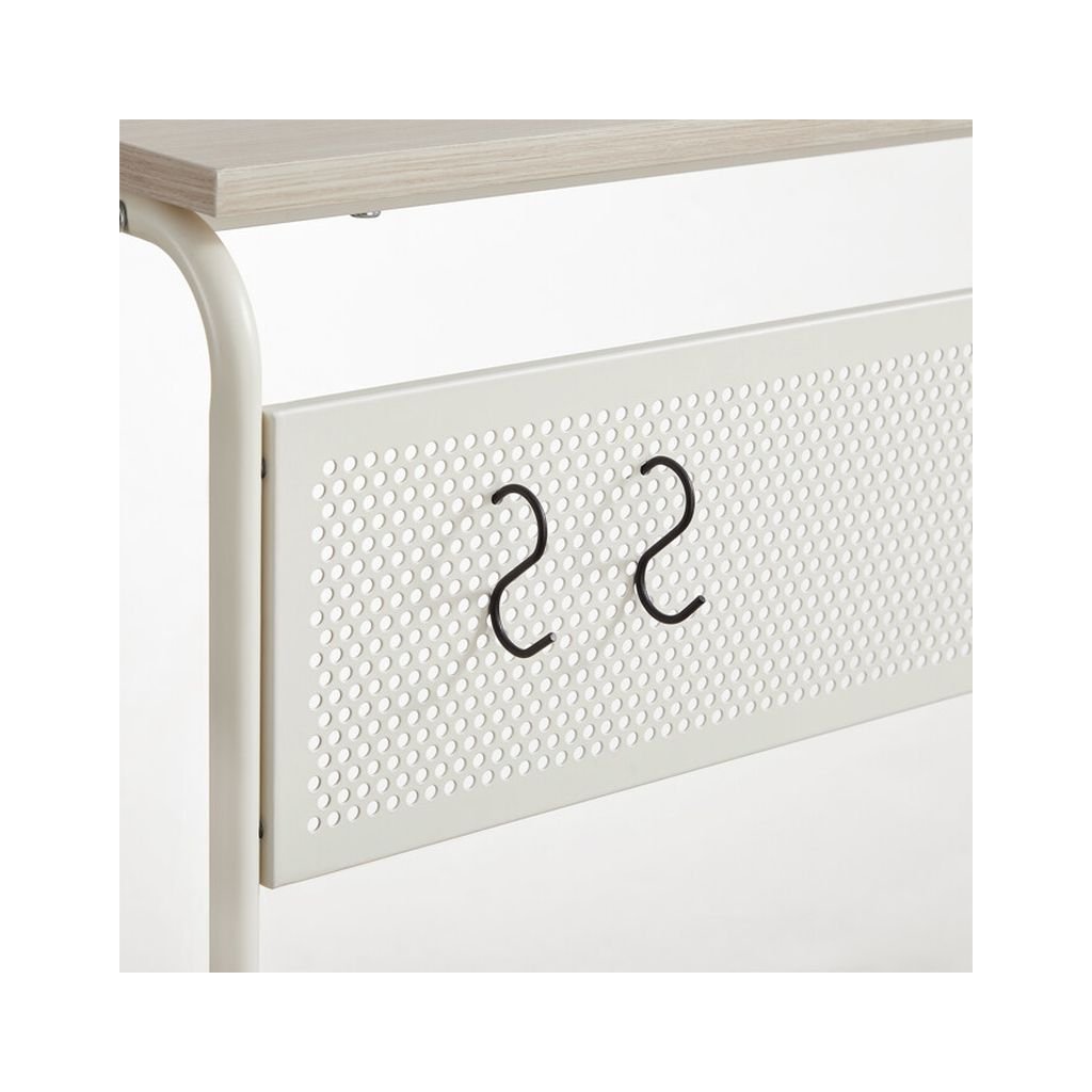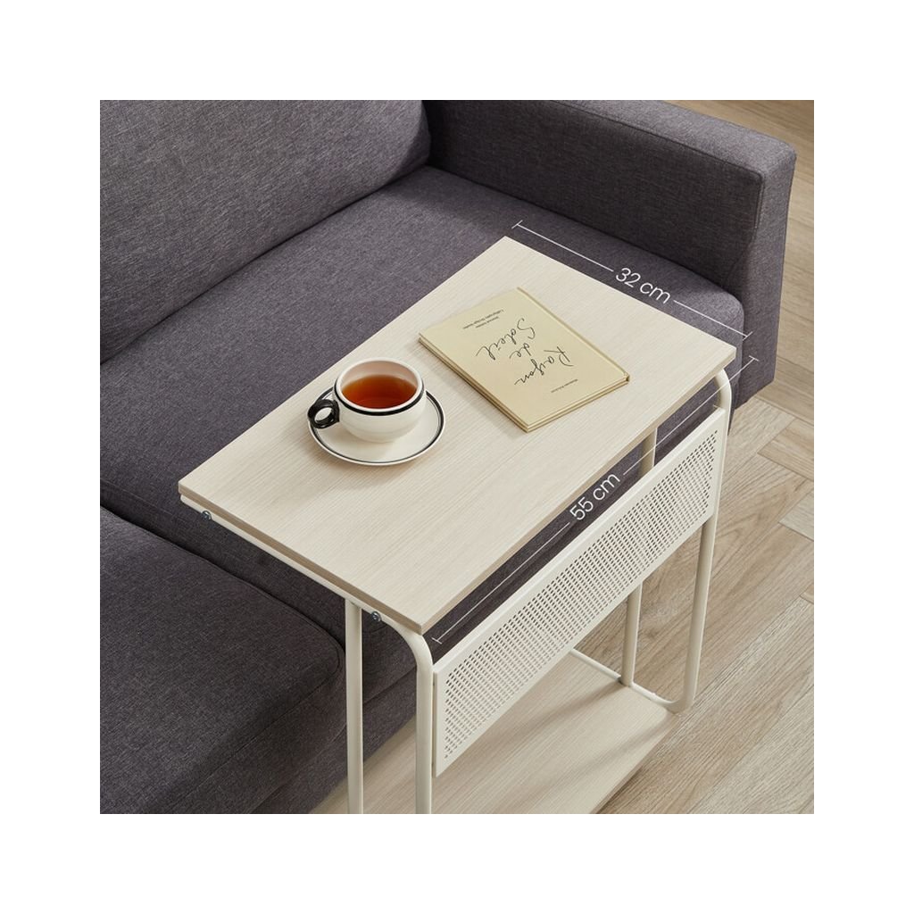 Stolík kombinuje dosku z MDF s dekorom bieleného dubu a pevnú kovovú konštrukciu v bielej farbe, čo zabezpečuje odolnosť a jednoduchú údržbu. Vďaka štyrom kolieskam sa ľahko presúva a prispôsobí sa tak vašim potrebám.