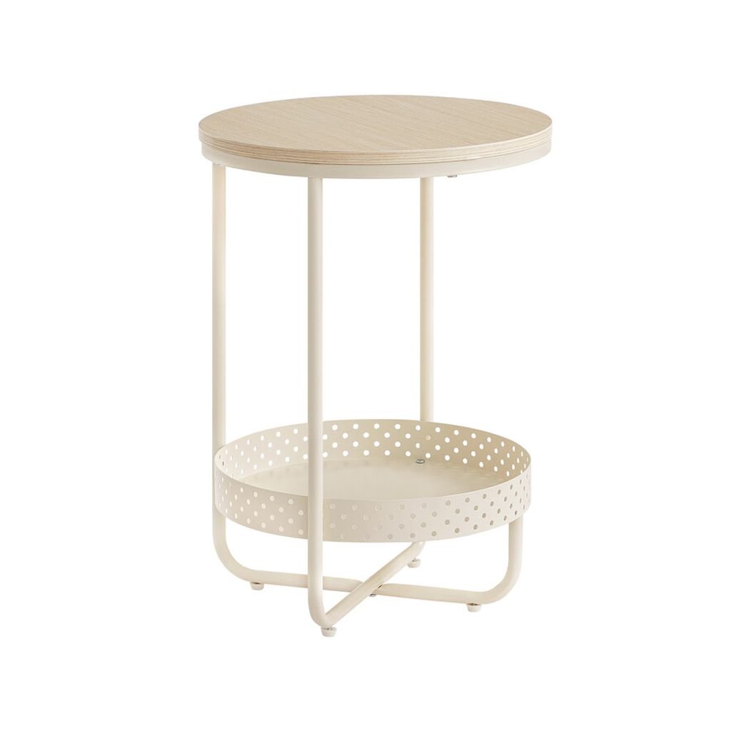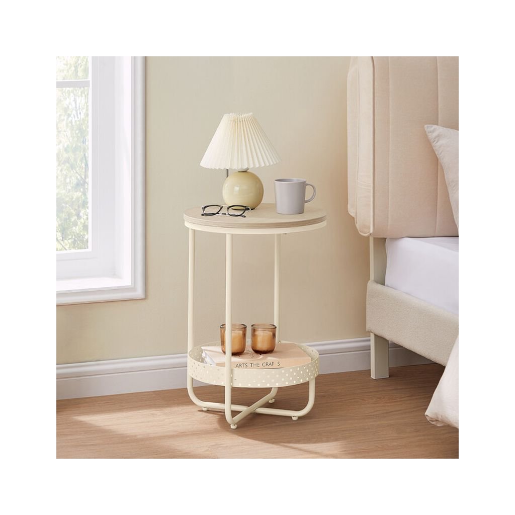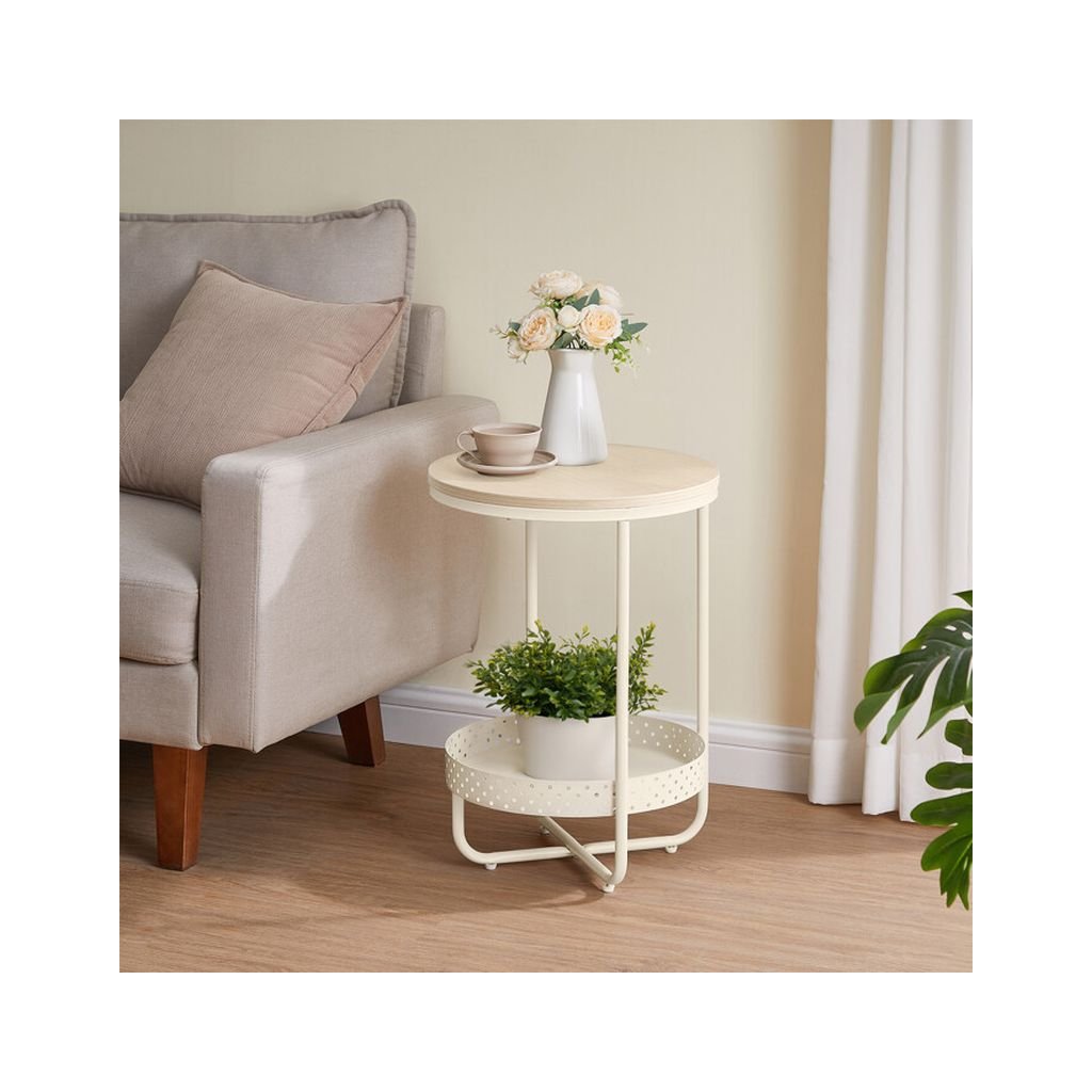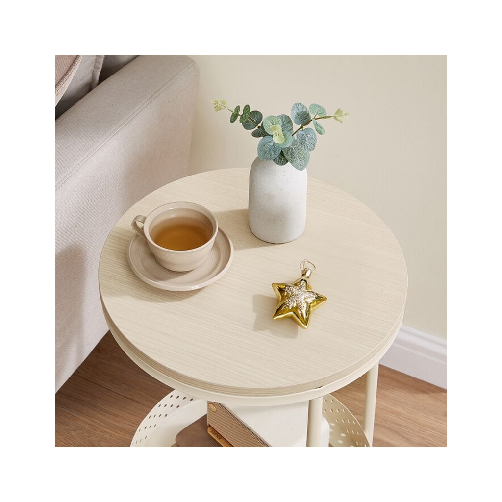 Konferenčný stolík GOTRI v béžovej farbe s rozmermi 40x40x55 cm kombinuje MDF dosku s dekorom bieleného dubu a pevné kovové nohy. Okrúhla doska a spodný odkladací priestor zabezpečujú praktické využit