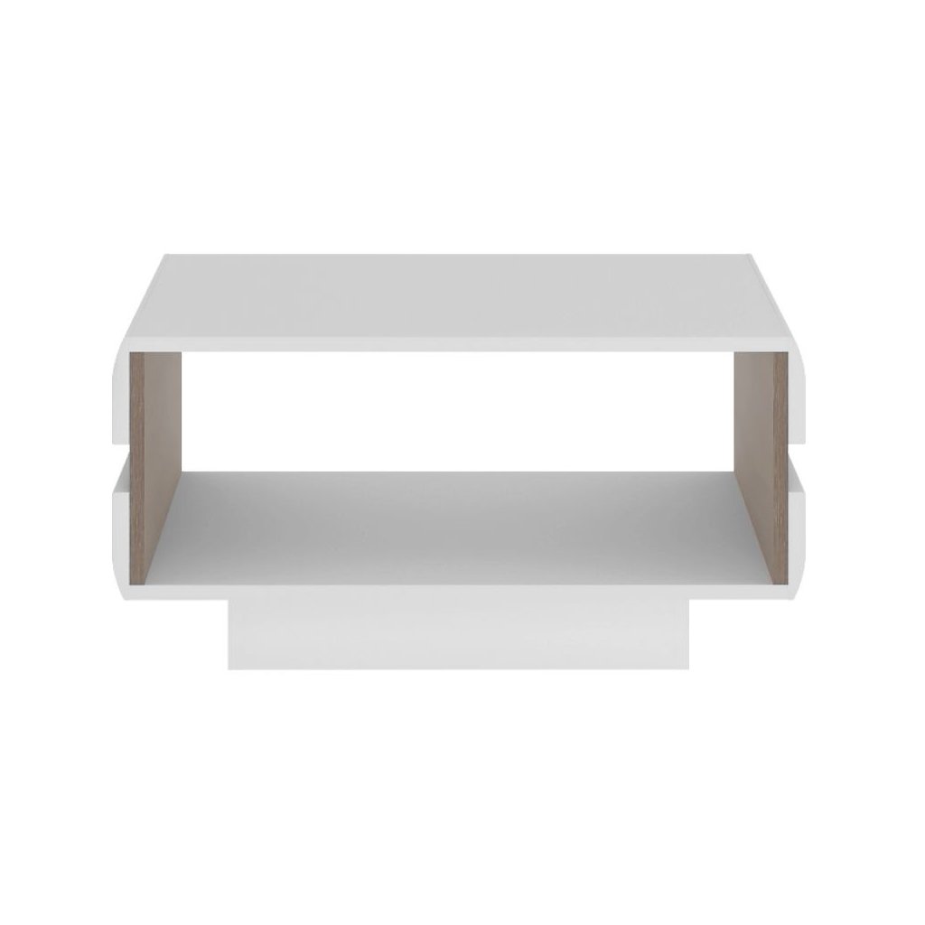 Konferenčný stolík v bielej farbe s dubom sonoma a extra vysokým leskom. Rozmery 75x75x39 cm, otvorený úložný priestor a moderné zaoblené hrany. Nosnosť 10 kg, dodávaný v demonte.