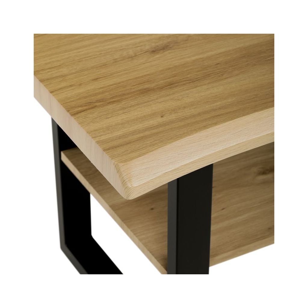 Konferenčný stolík MALOR v dekore prírodného duba spojuje eleganciu a funkčnosť. Robustná kovová konštrukcia zaručuje stabilitu, zatiaľ čo atypický tvar MDF dosky a spodná polica poskytujú praktický ú