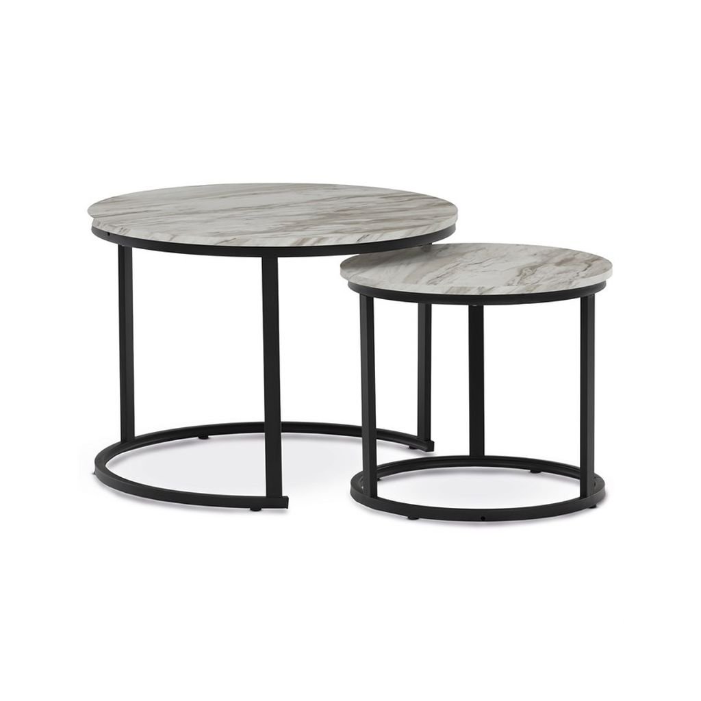 Konferenčný stolík MONA v bielom mramorovom dekore ponúka moderný dizajn a praktické riešenie. Pevné kovové podnože zabezpečujú stabilitu, menší stolík je zasúvateľný pod väčší.