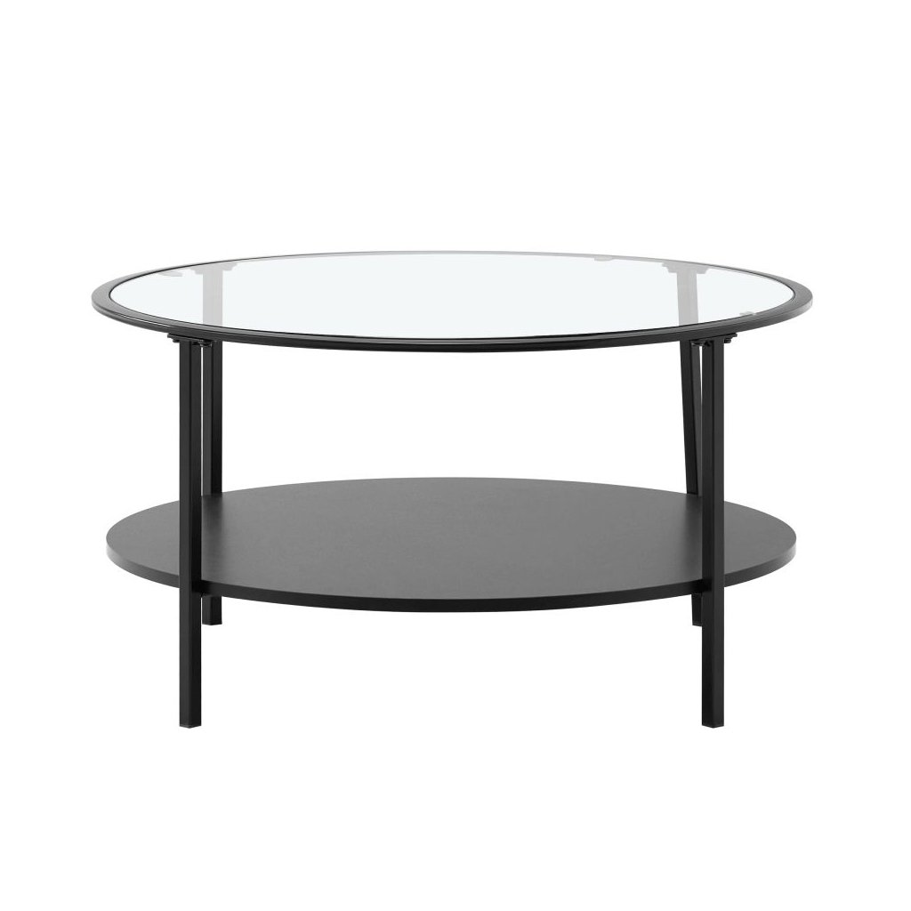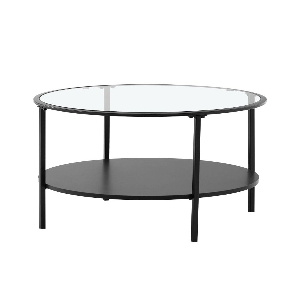 Konferenčný stolík PARLAN v čiernej farbe kombinuje moderný dizajn s praktickým úložným priestorom. Okrúhly tvar a kovové nohy dopĺňajú tvrdené sklo s hrúbkou 8 mm. Nosnosť 50 kg. Dodávaný v demonte.