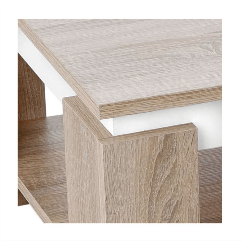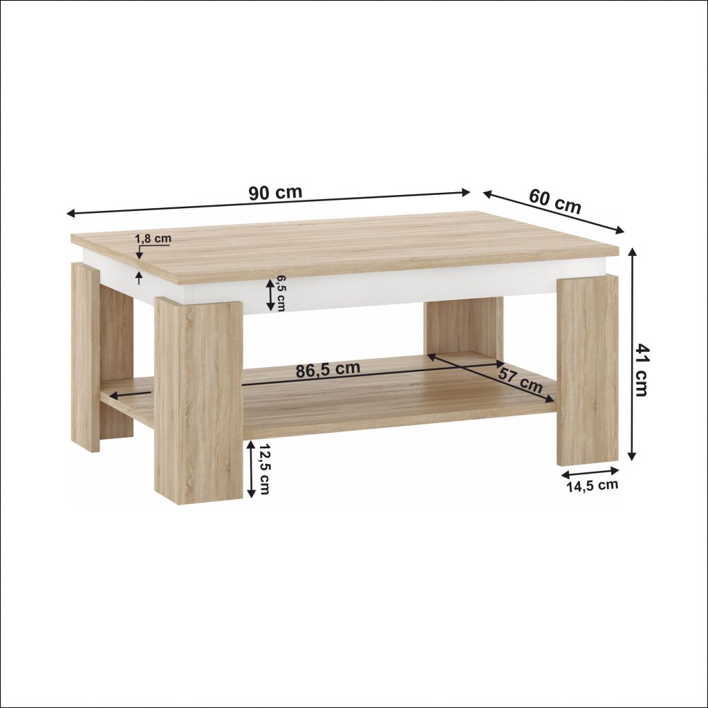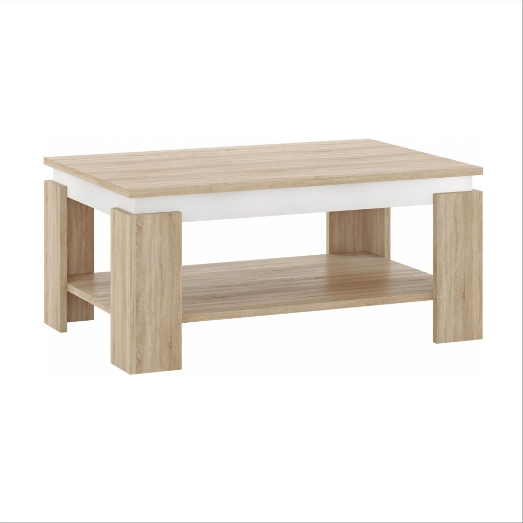 Konferenčný stolík PIANI v elegantnej kombinácii dub sonoma a bielej farby je ideálnym doplnkom pre každú obývaciu izbu. Jeho moderný dizajn a praktické funkcie z neho robia skvelú voľbu pre tých, ktorí hľadajú štýlové a funkčné riešenie. Stolík ponúka dostatok odkladacieho priestoru pre všetky vaše potreby, čím prispieva k organizácii a pohodliu vo vašom domove.