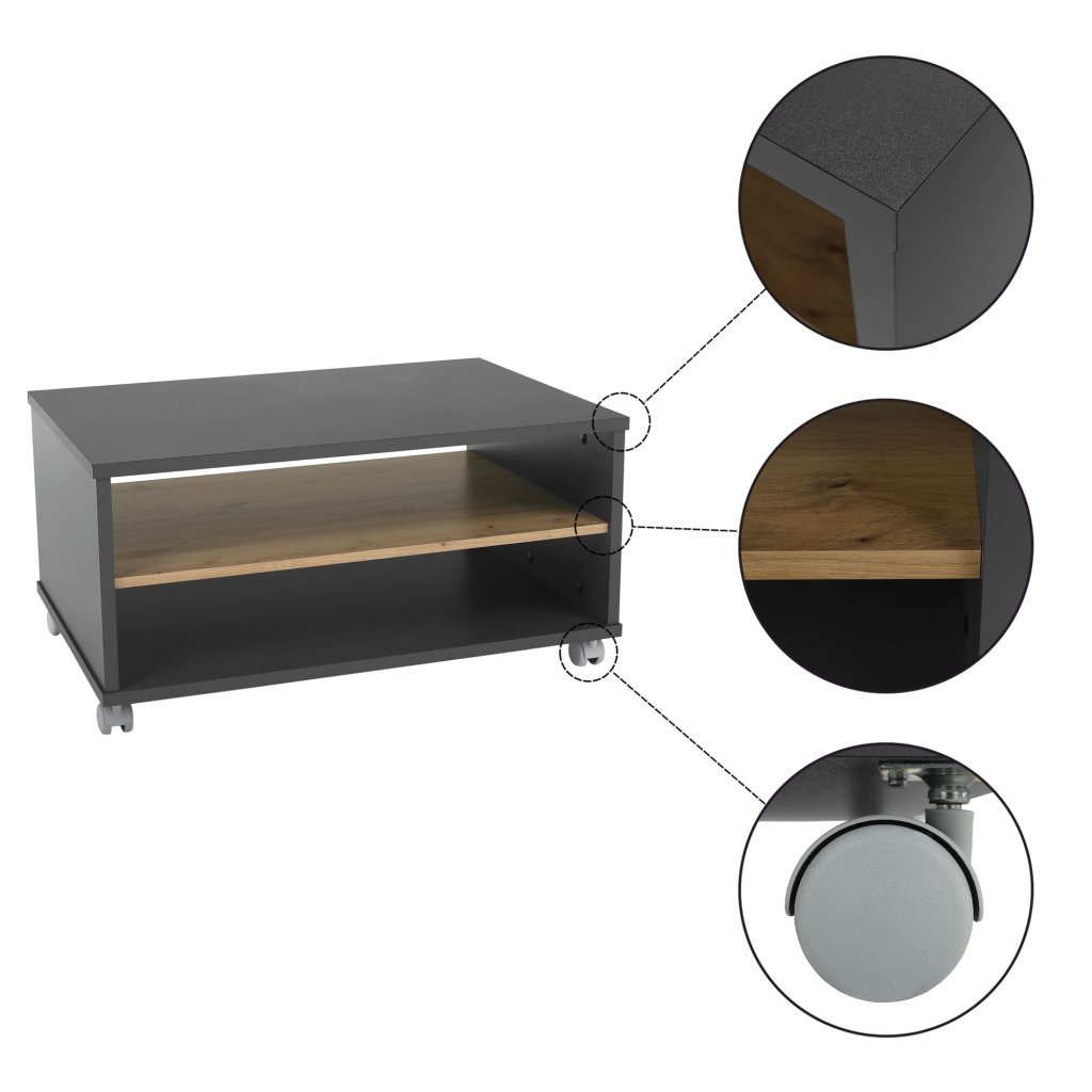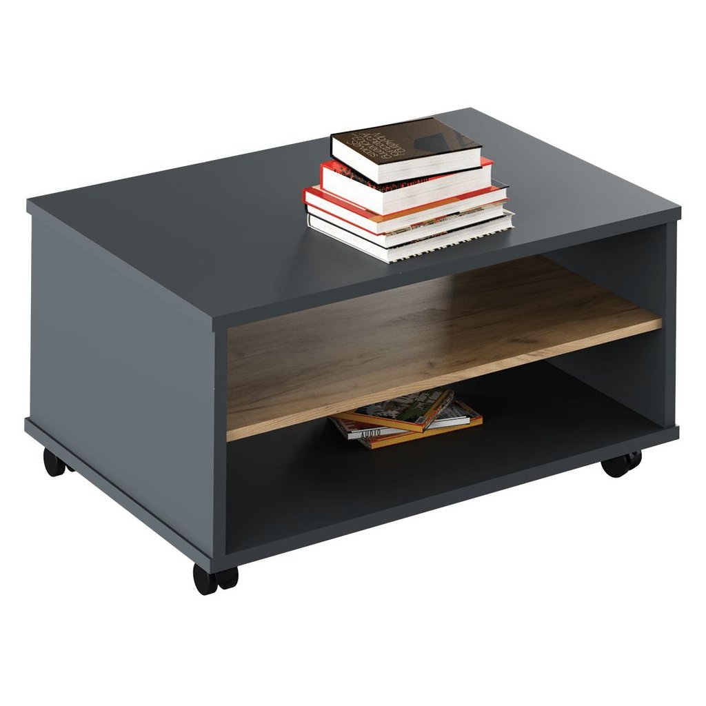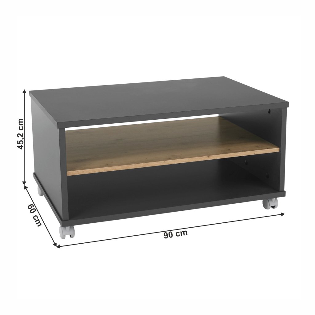 Konferenčný stolík v modernom farebnom prevedení grafit a dub artisan. Vyrobený z laminovanej DTD, s rozmermi 90x60x45,2 cm. Obsahuje otvorený úložný priestor. Dodávané v demonte.