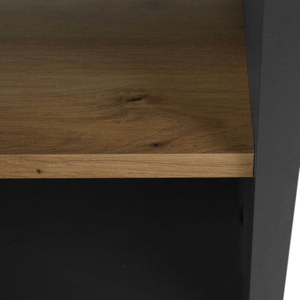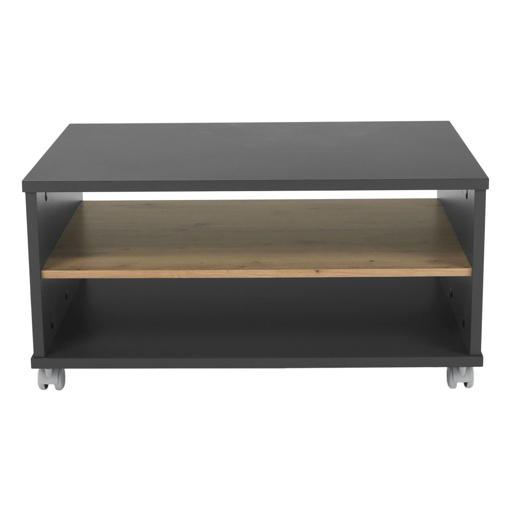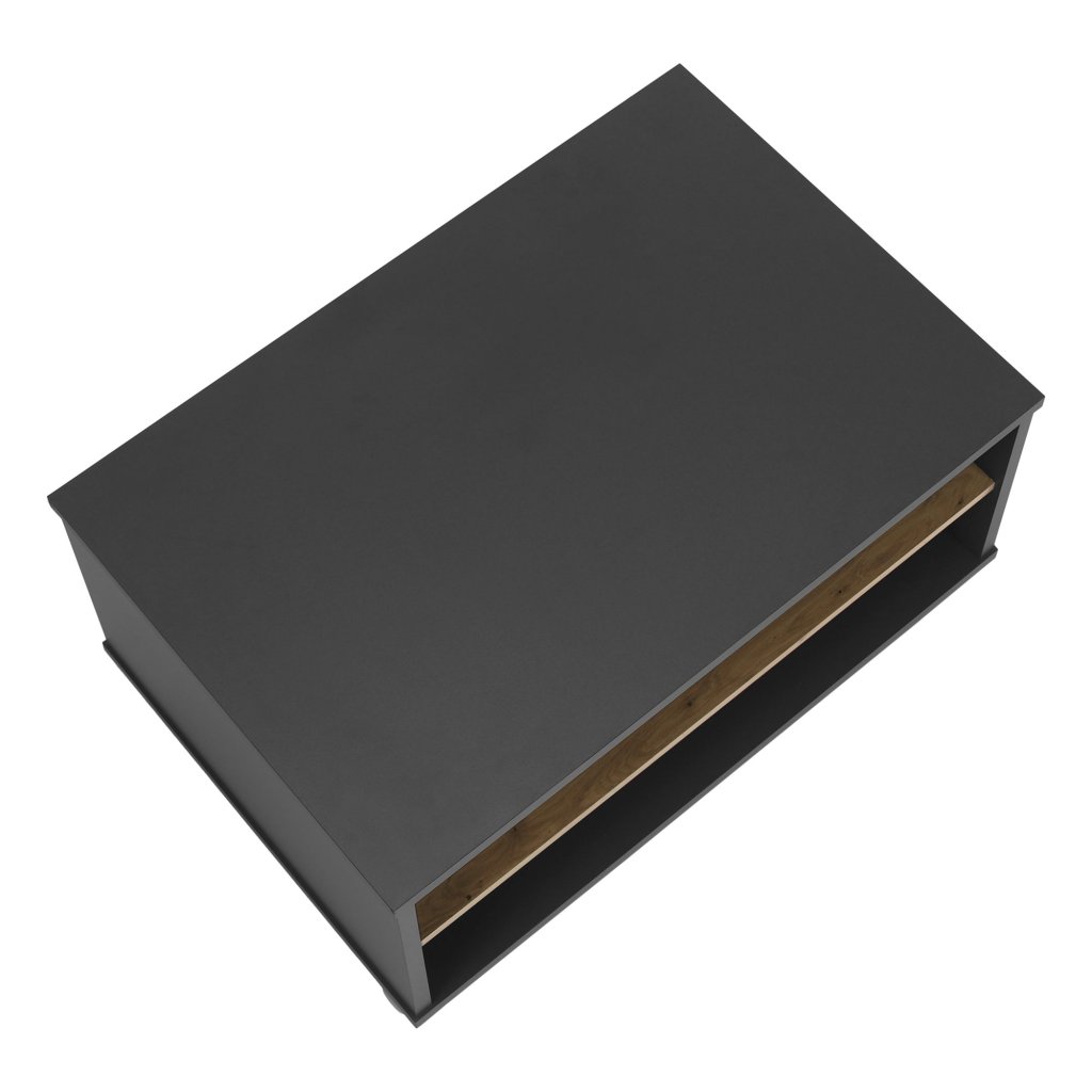 Konferenčný stolík v modernom farebnom prevedení grafit a dub artisan. Vyrobený z laminovanej DTD, s rozmermi 90x60x45,2 cm. Obsahuje otvorený úložný priestor. Dodávané v demonte.