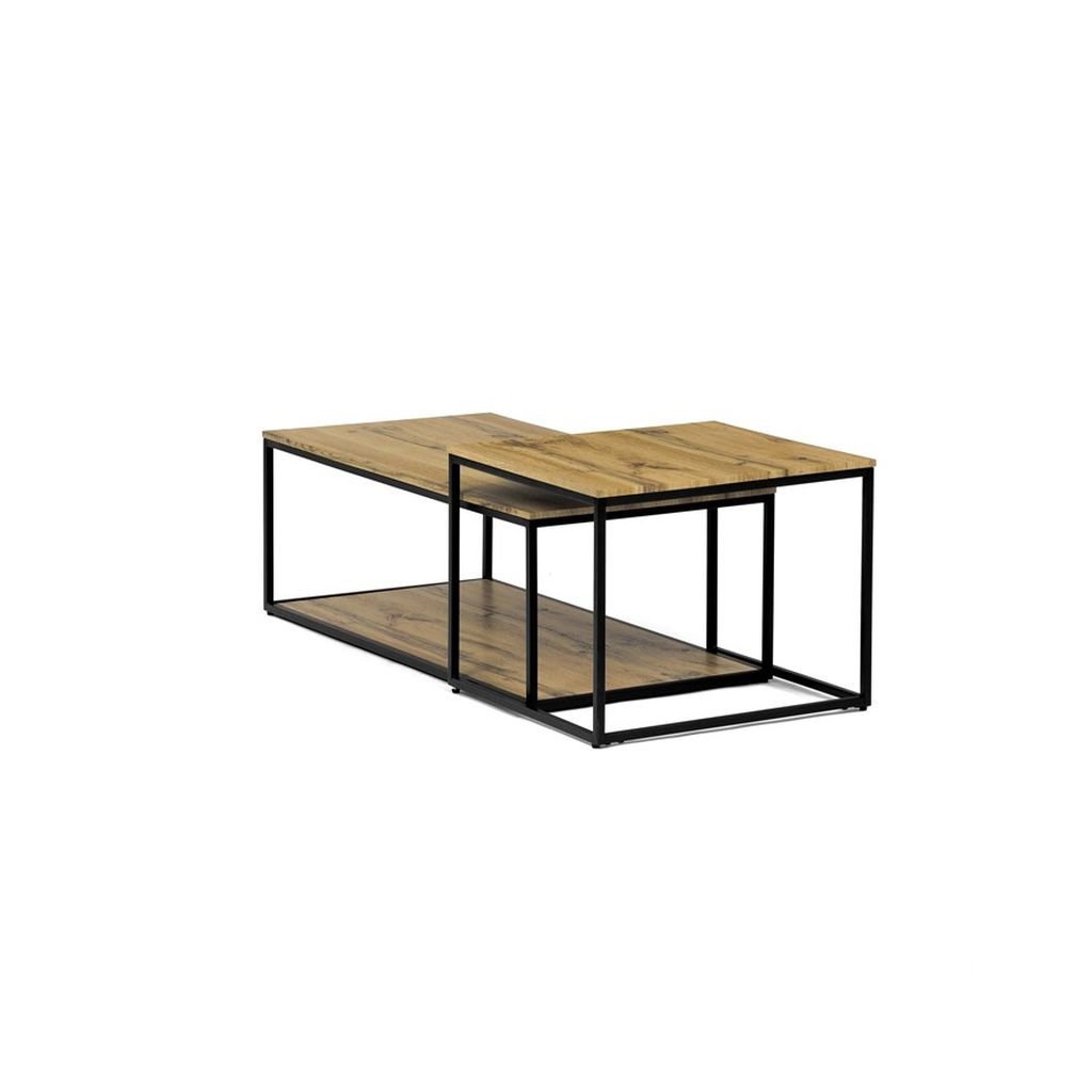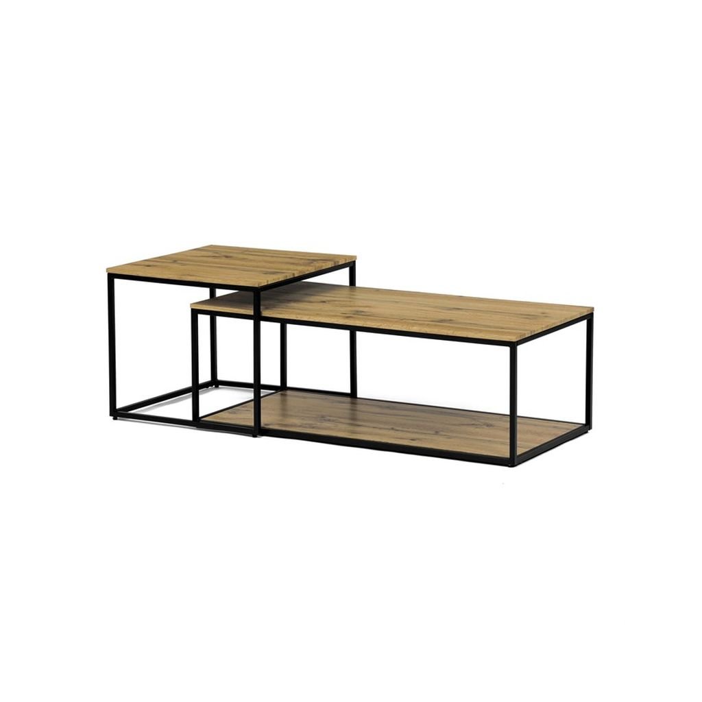 Konferenčný stolík SAVEN v industriálnom štýle ponúka elegantný dizajn s doskou z MDF v dekore divokého duba a čiernou kovovou konštrukciou. Dvojúrovňový dizajn zabezpečuje praktický úložný priestor.